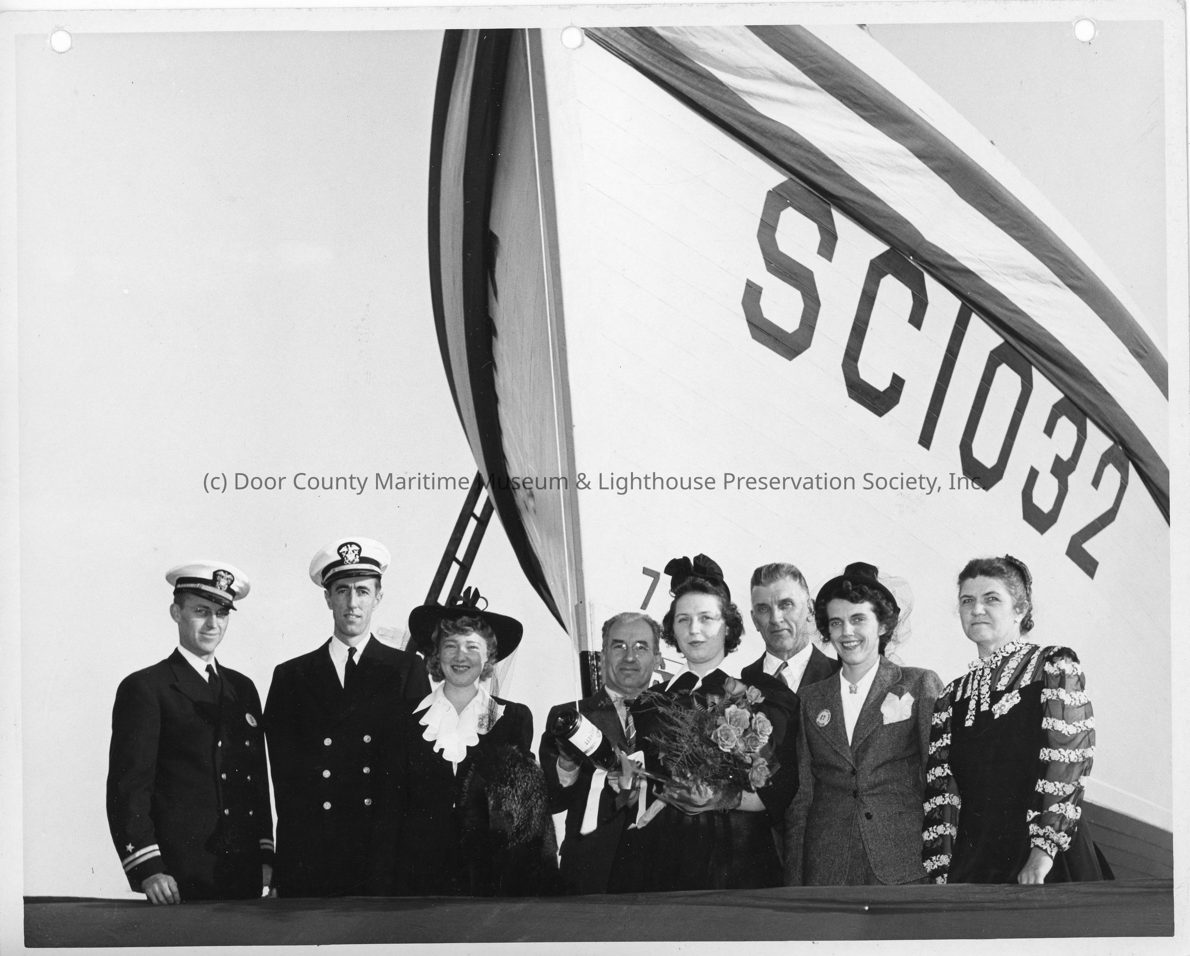 Sponsor party in christening box along with Fred Peterson at christening of SC-1032 October 17, 1942Entry/Object ID