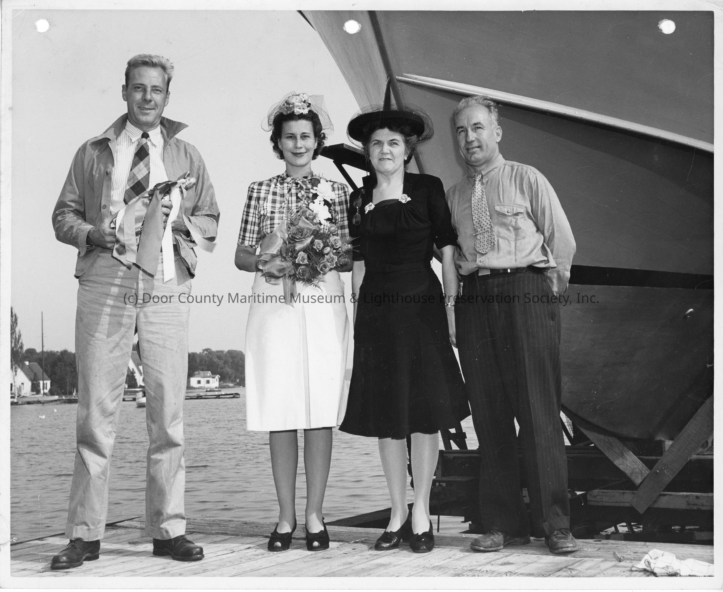 Sponsor party posing in front of P-573 at Peterson Boat Works September 11, 1944Entry/Object ID