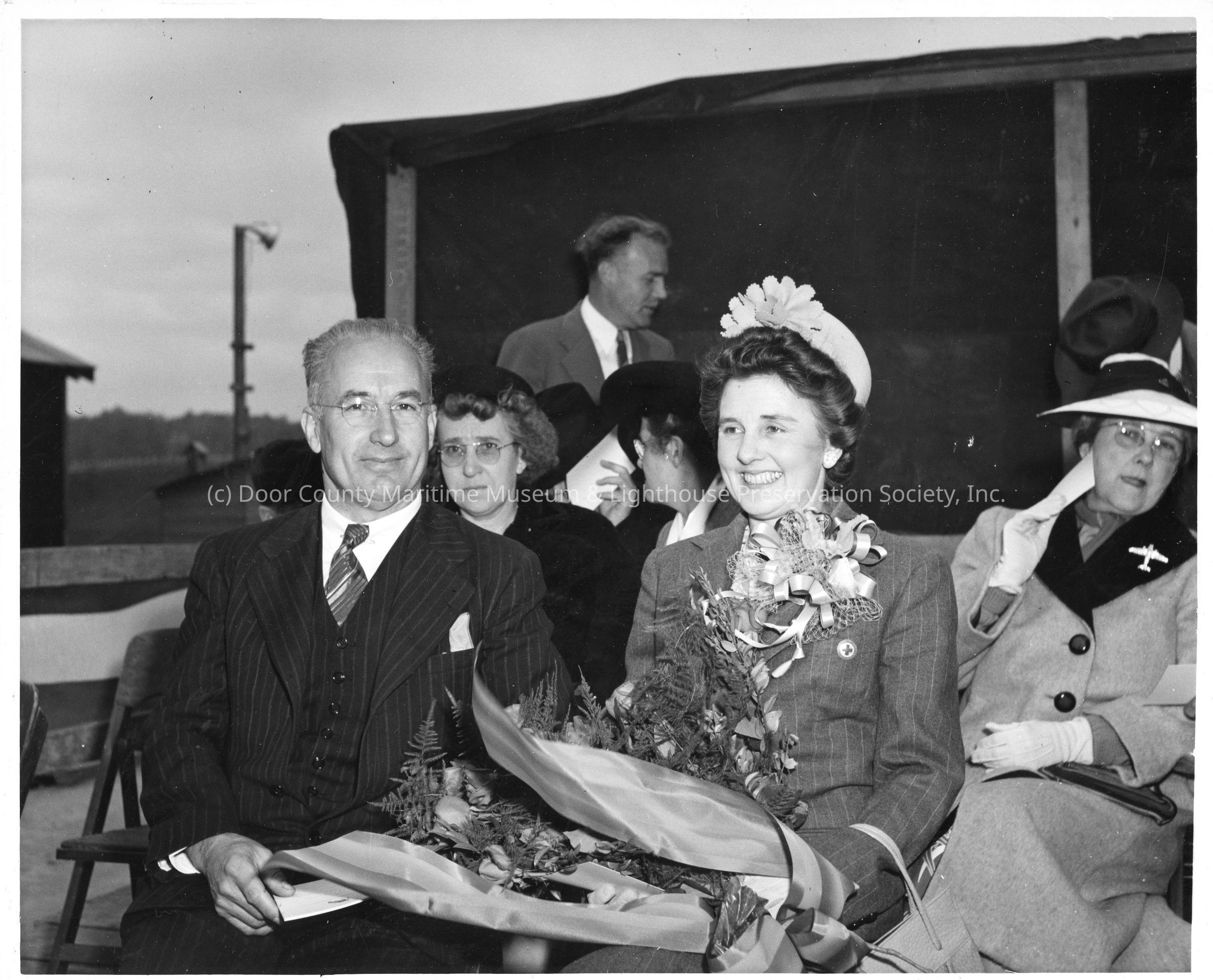 Sponsor party sitting at ship christening at Peterson Boat Works
