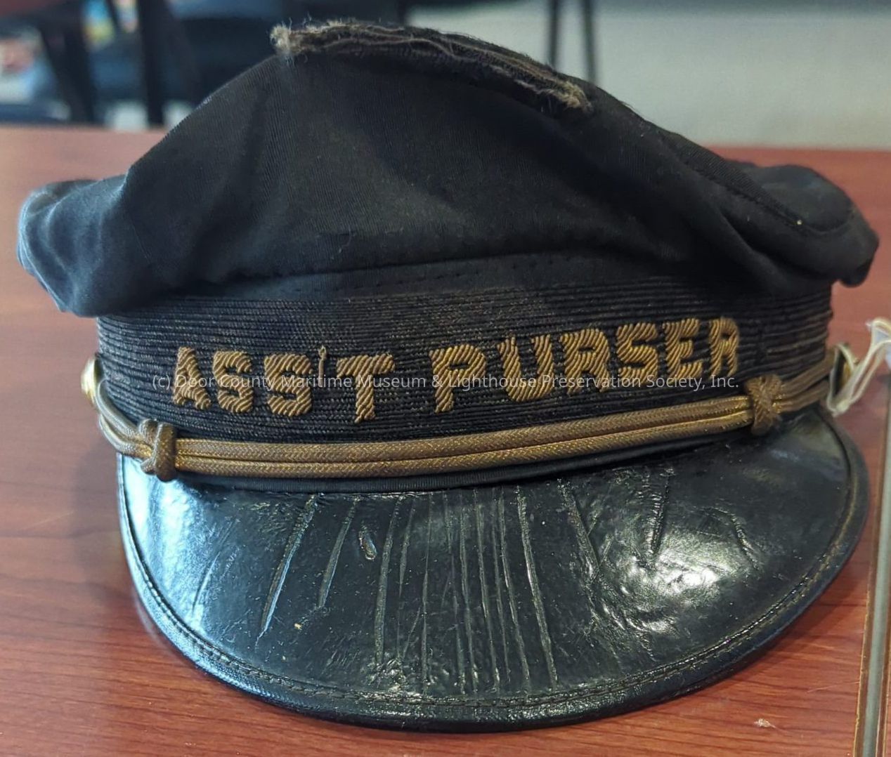 Cap, service: black with gold braid and two gold buttons; "Ass't. Purser" in gold; black plastic-coated visor; brown leather headband (inside): slit on top from that had been sewed; visor has scratches; two ventilation holes on each side.Location