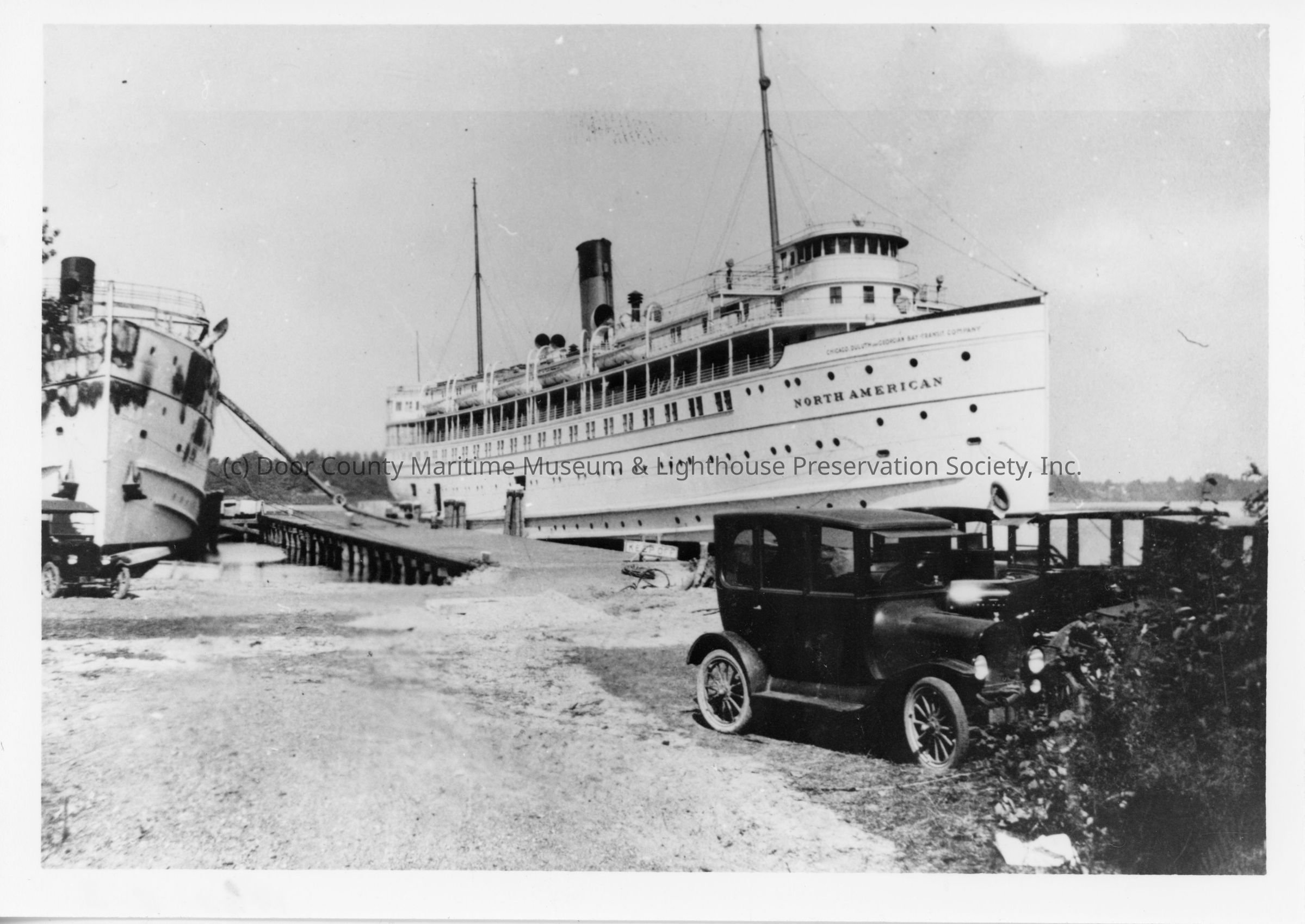 Colorless photograph. Depicts the "North American" of the Chicago, Duluth, and Georgia Bay Transit Company, at a pier in the center backround. Ship under repair on left, may be the "South American". Vintage automobiles in the right foreground.Location