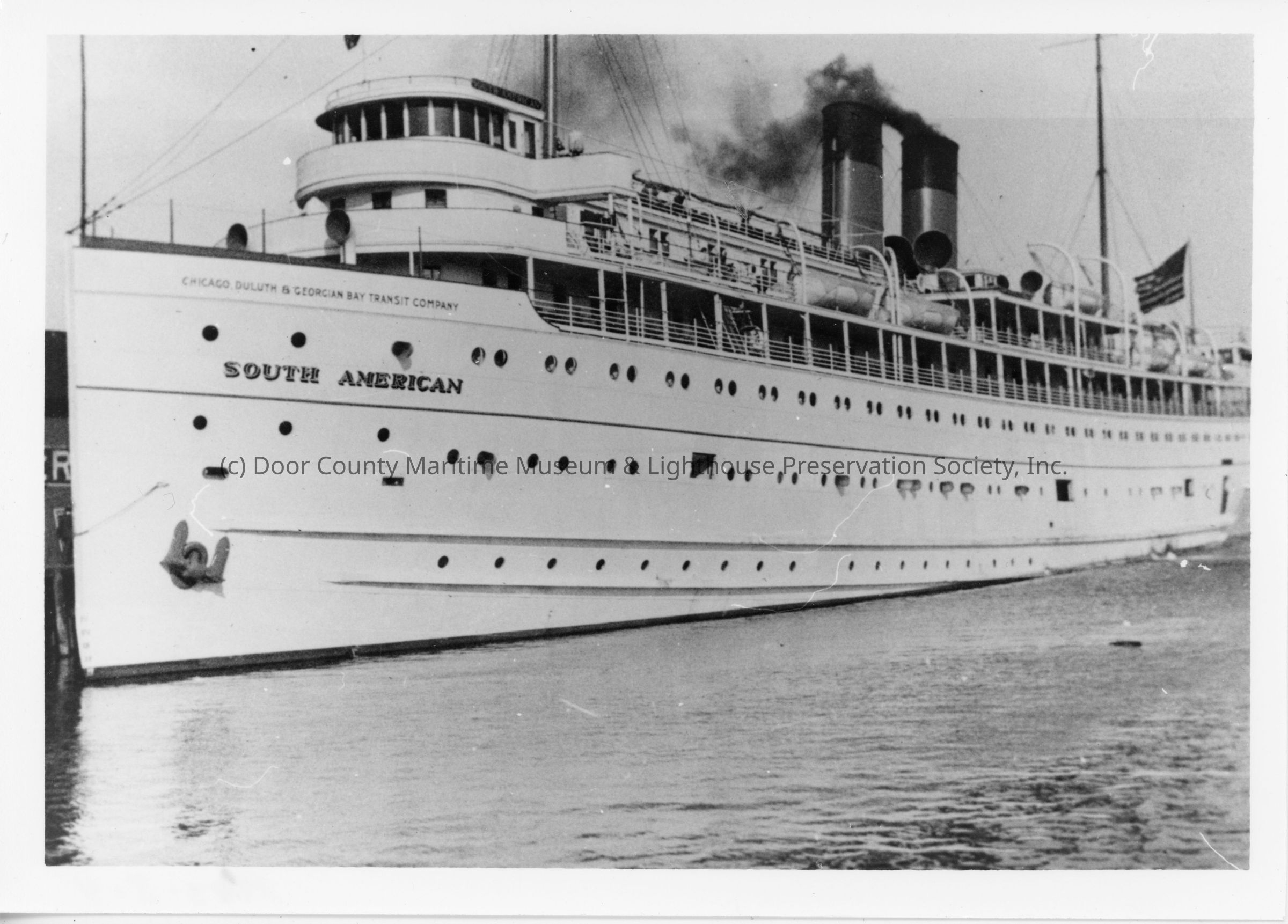 Colorless photograph. Depicts the "S.S. South American" of the Chicago, Duluth, and Georgia Bay Transit Company, close-up under way. Wind from stern. Placed in waterLocation