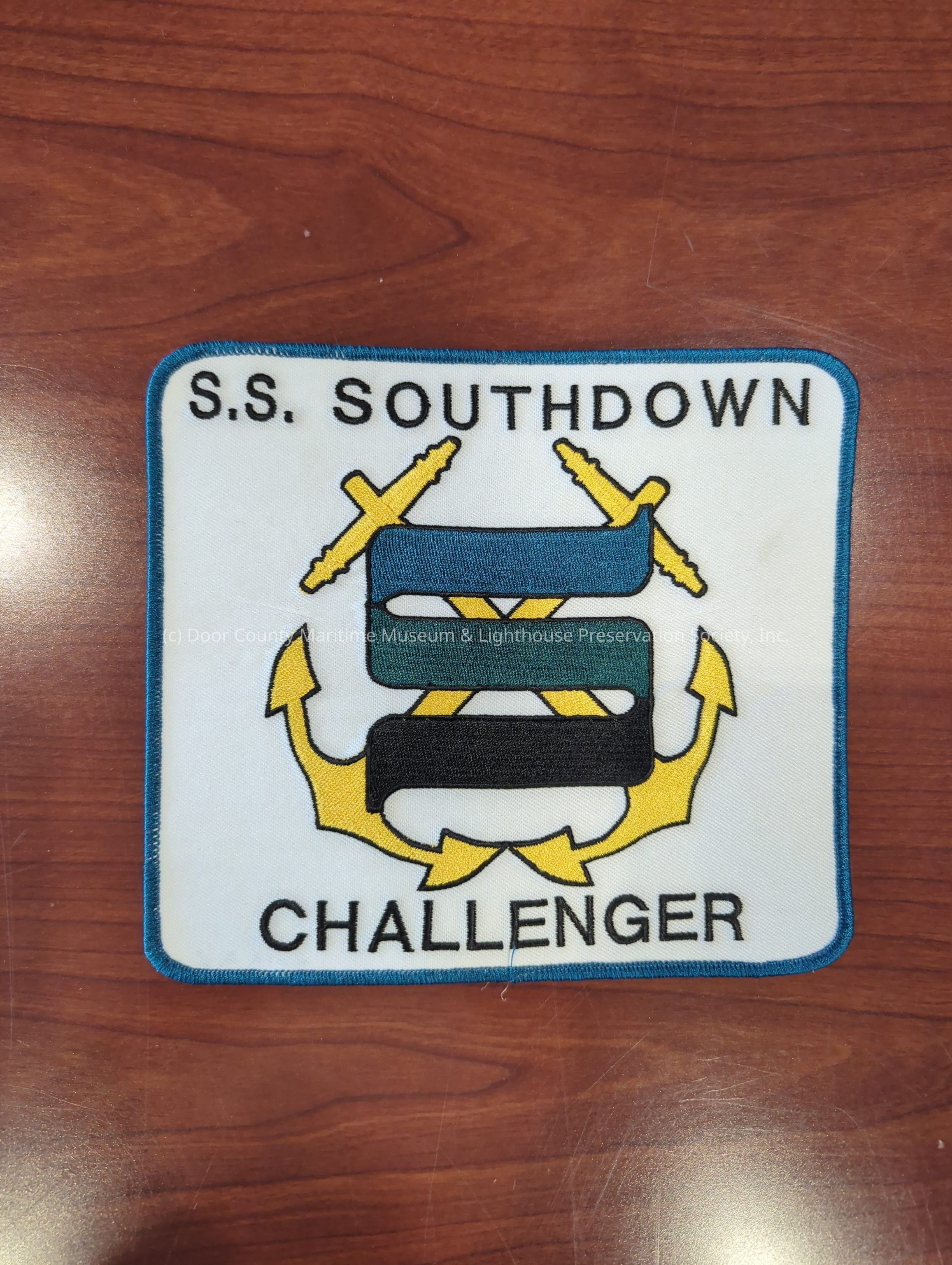 Square “SS Southdown Challenger" Patch. White with blue trim with Black print. Two crossed yellow anchors. Blue, green, and black “S”Location