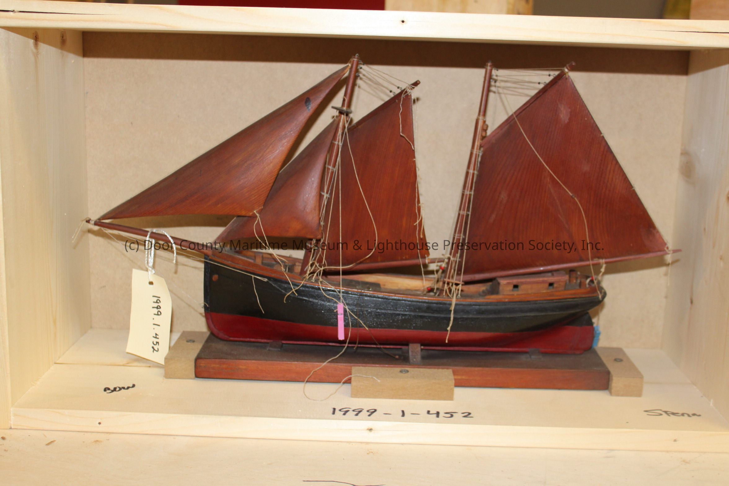 two masted schooner; St. Ann; brown varnish; red and black hull; has base