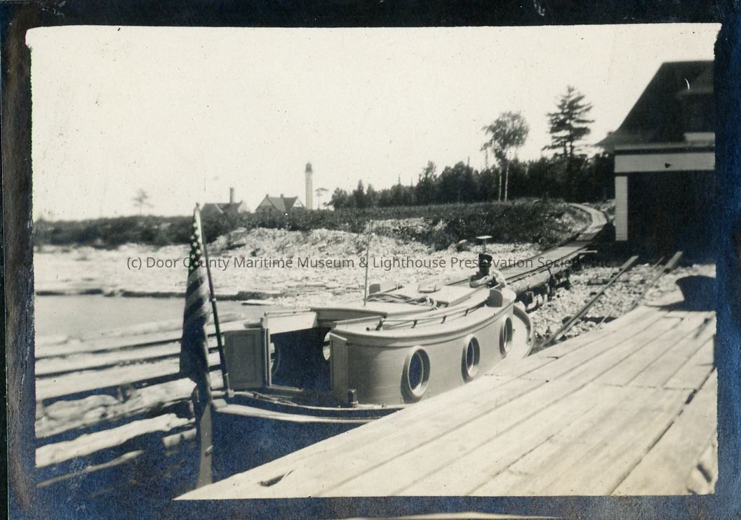 Man stands at St. Martin's Island lighthouse boat shed. Boat is at launch/retrieve tracks in front of a boathouse. The lighthouse can be seen in the background, farther down the beach. Rail tracks lead away from the site, toward the lighthouse.Location