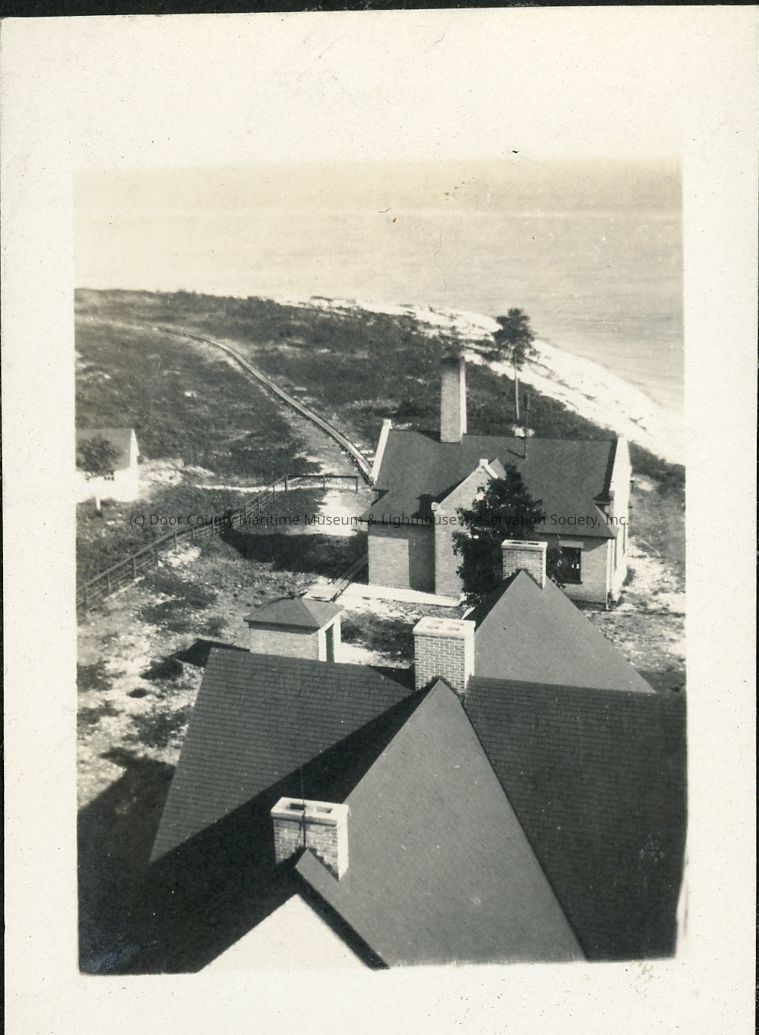 Elevated view of St. Martin's Island lighthouse buildings. Rails leading to boathouse are visible.Location