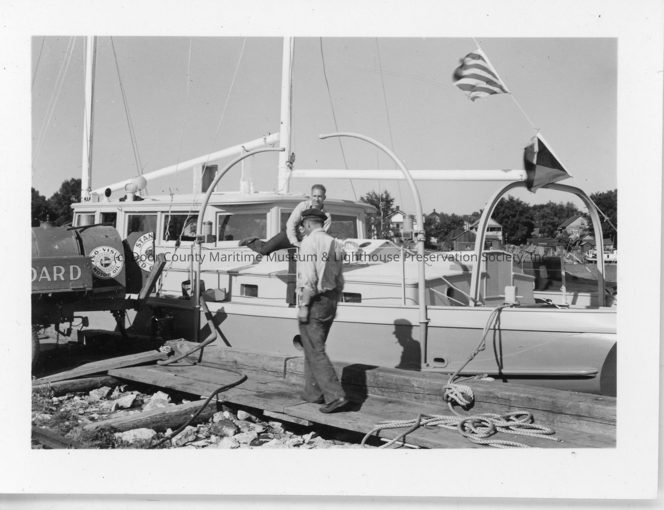Standard Oil truck unloading barrels onto the docked sailboat Mako 1937