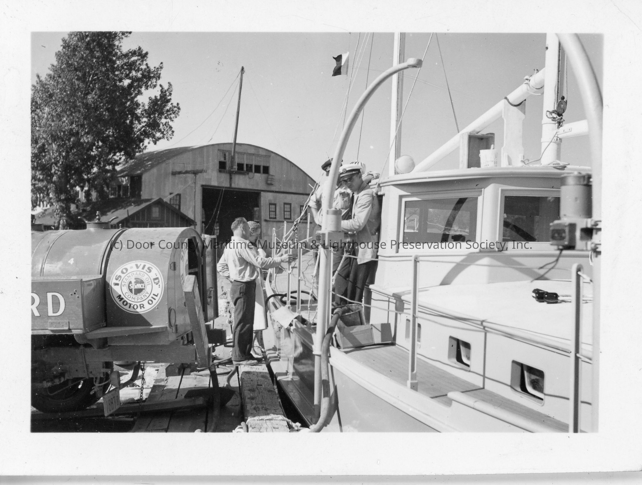 Standard Oil truck unloading barrels onto the docked sailboat Mako 1937