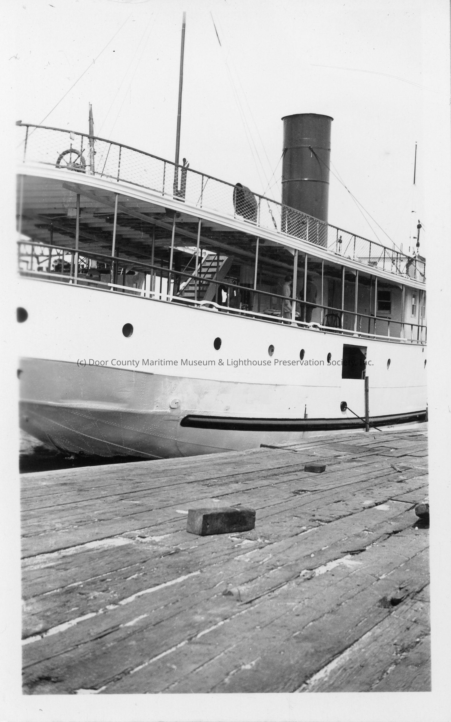 Starboard stern view of docked steamship