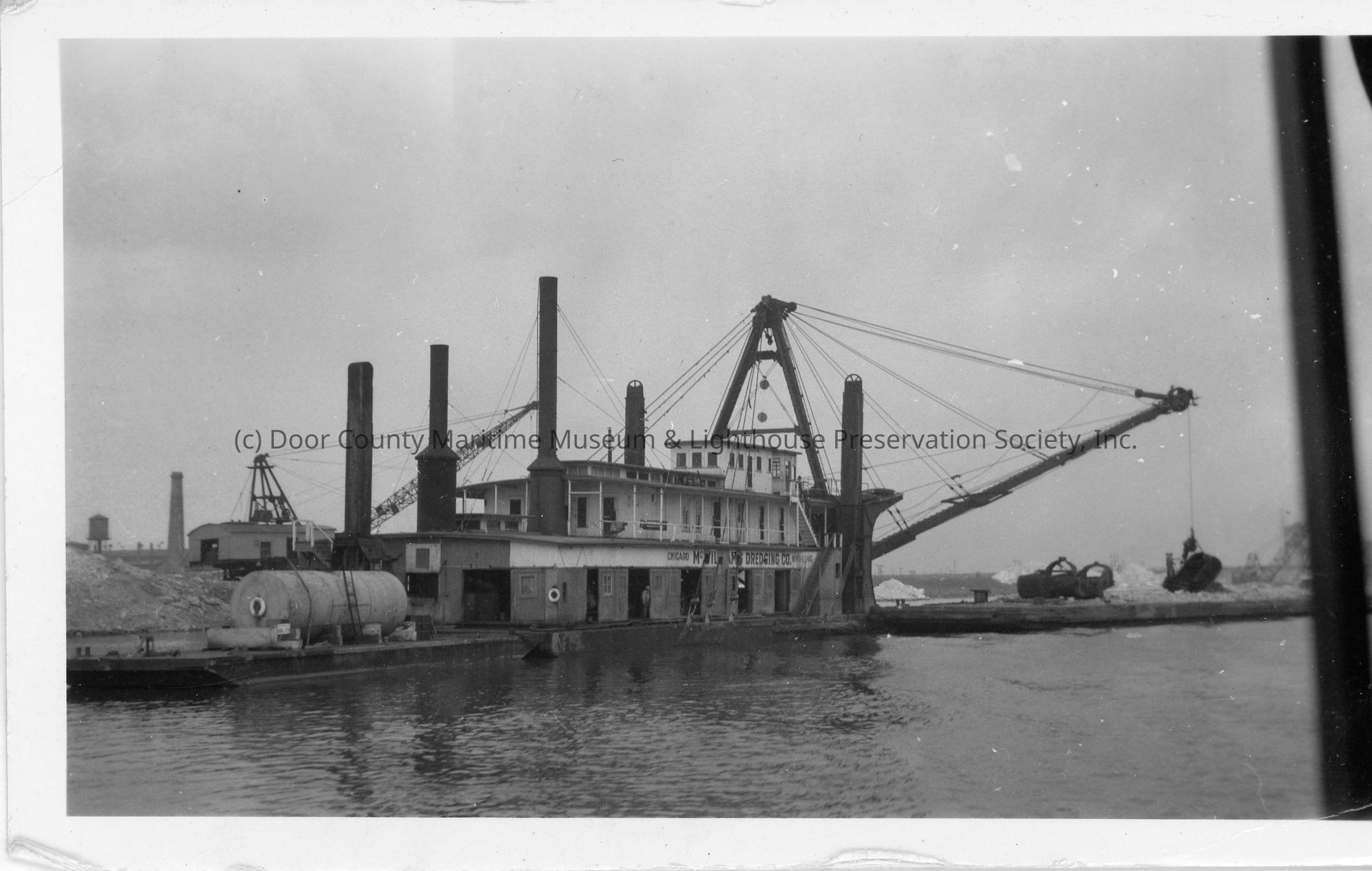 Starboard stern view of dredge behind a stone barge