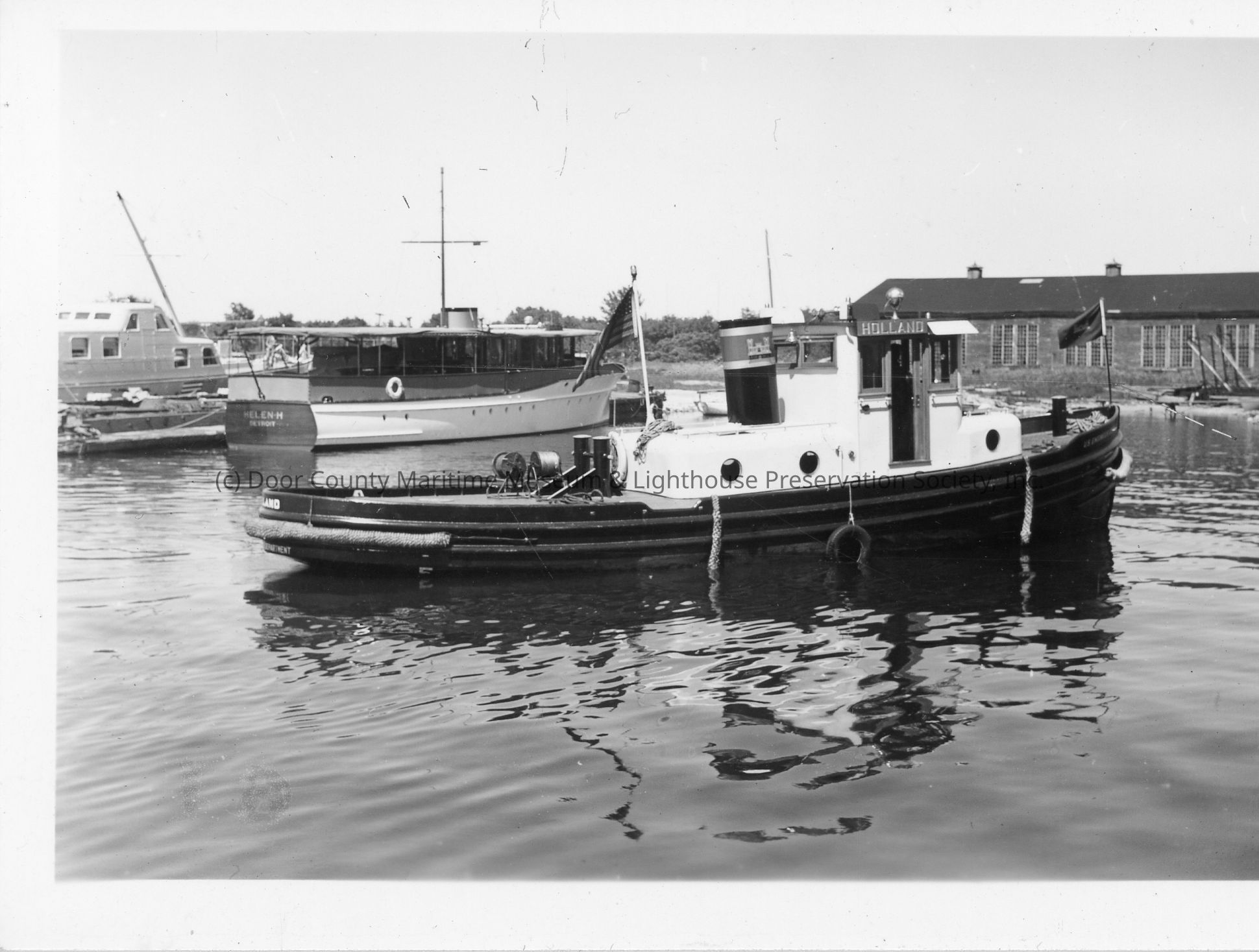 Starboard view of ACE tugboat Holland with ships and buildings in background