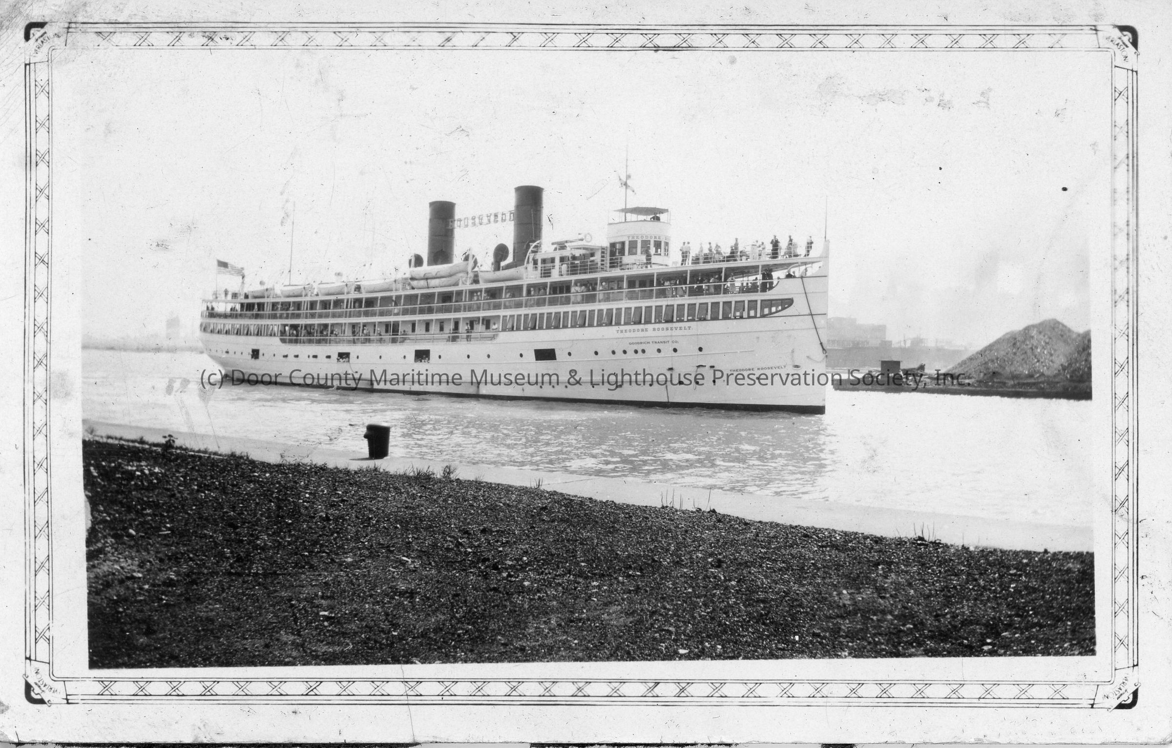 Starboard view of SS Theodore Roosevelt underway with city in background