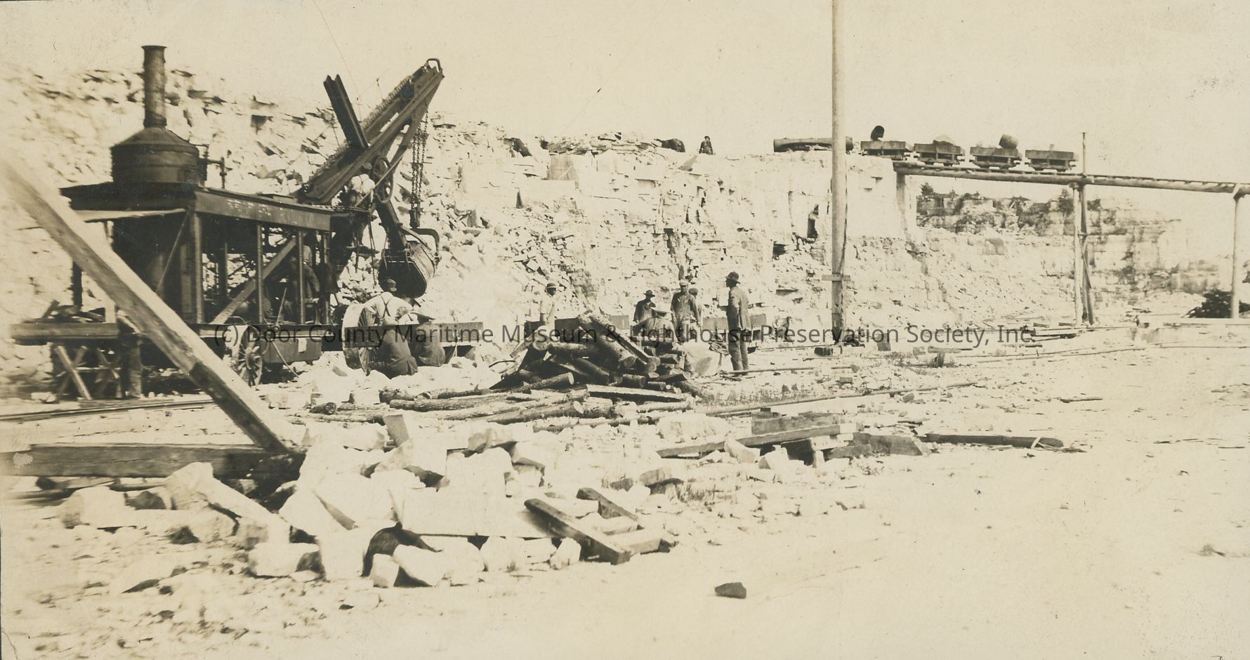 Workers at stone quarry next to steam shovel. In background rail cars on trestle carry stone.