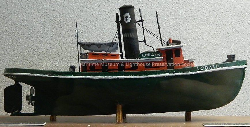 steam tug; name Lorain on bow; black stack with white "G" nameplate on cabin; green hull with white stripes; cabin red and white top; light blue or gray deck and lifeboat; mahogany and glass display case