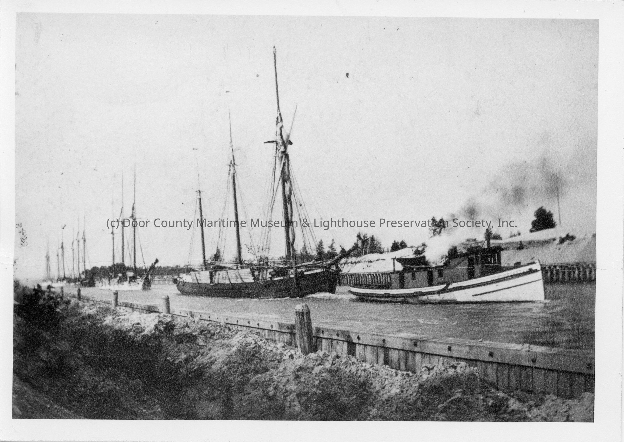 Steam tug towing sailing vessels through canal