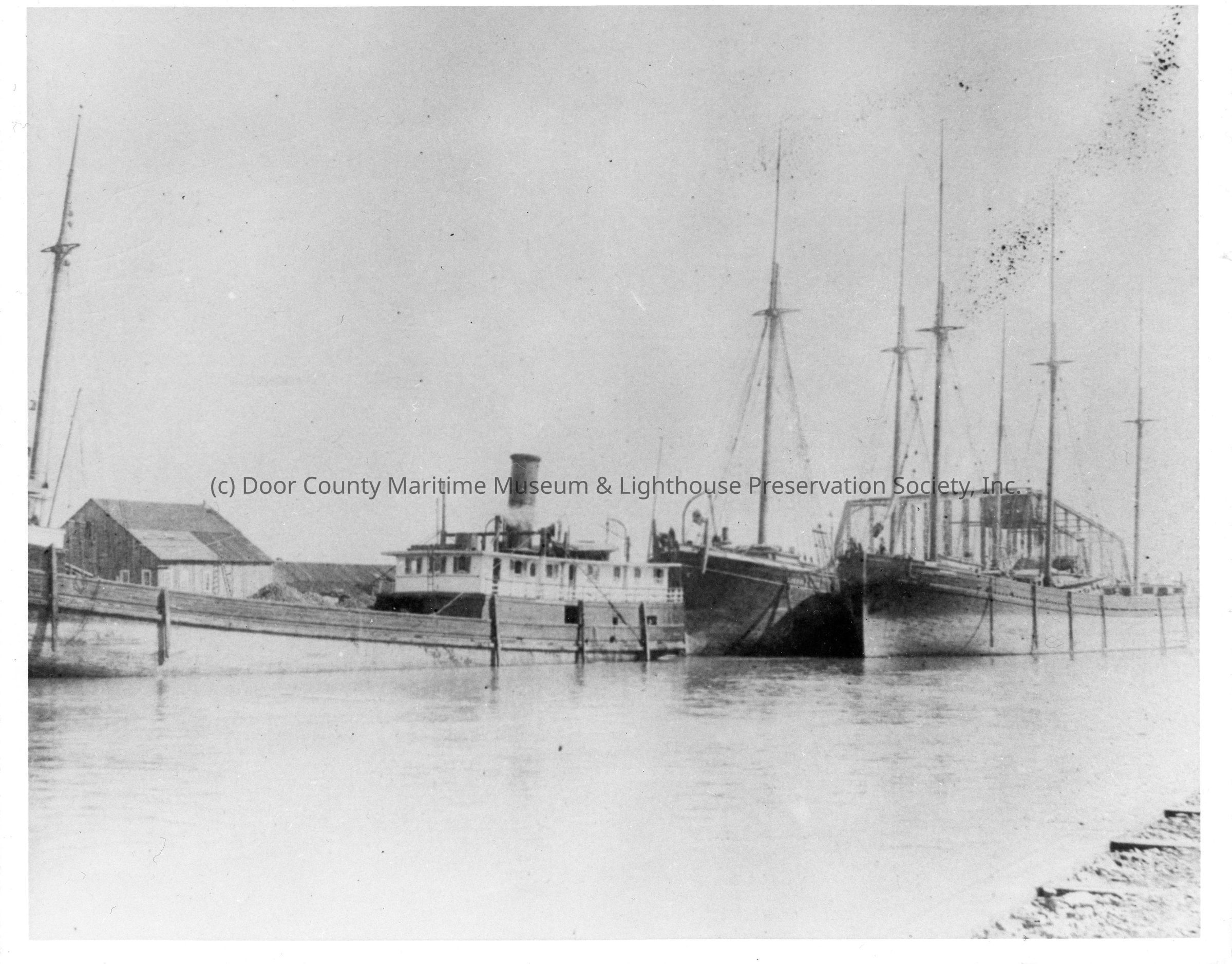 Steamers White and Friant docked alongside schooner Lizzie A. Law