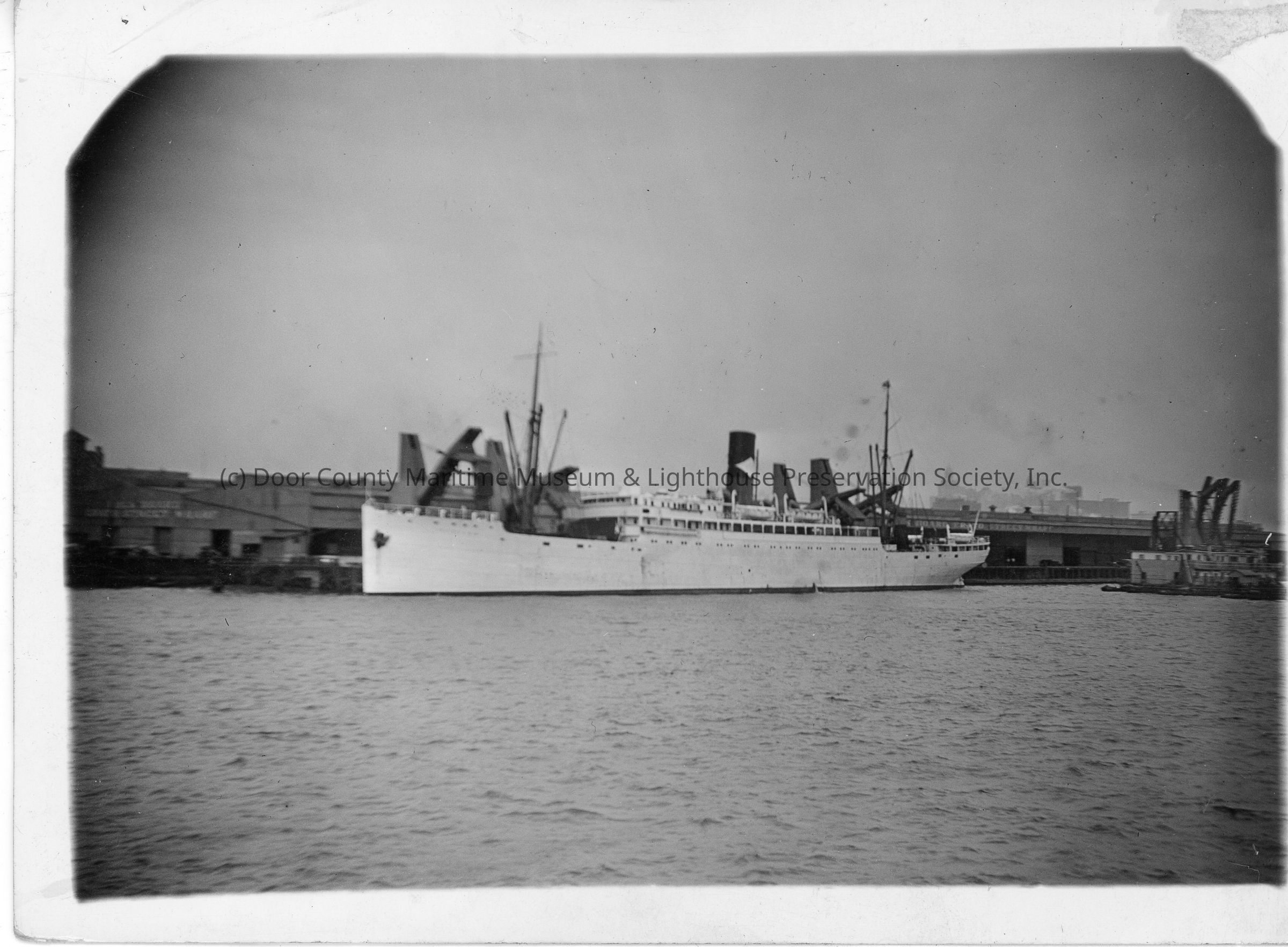 Steamship docked with buildings in background