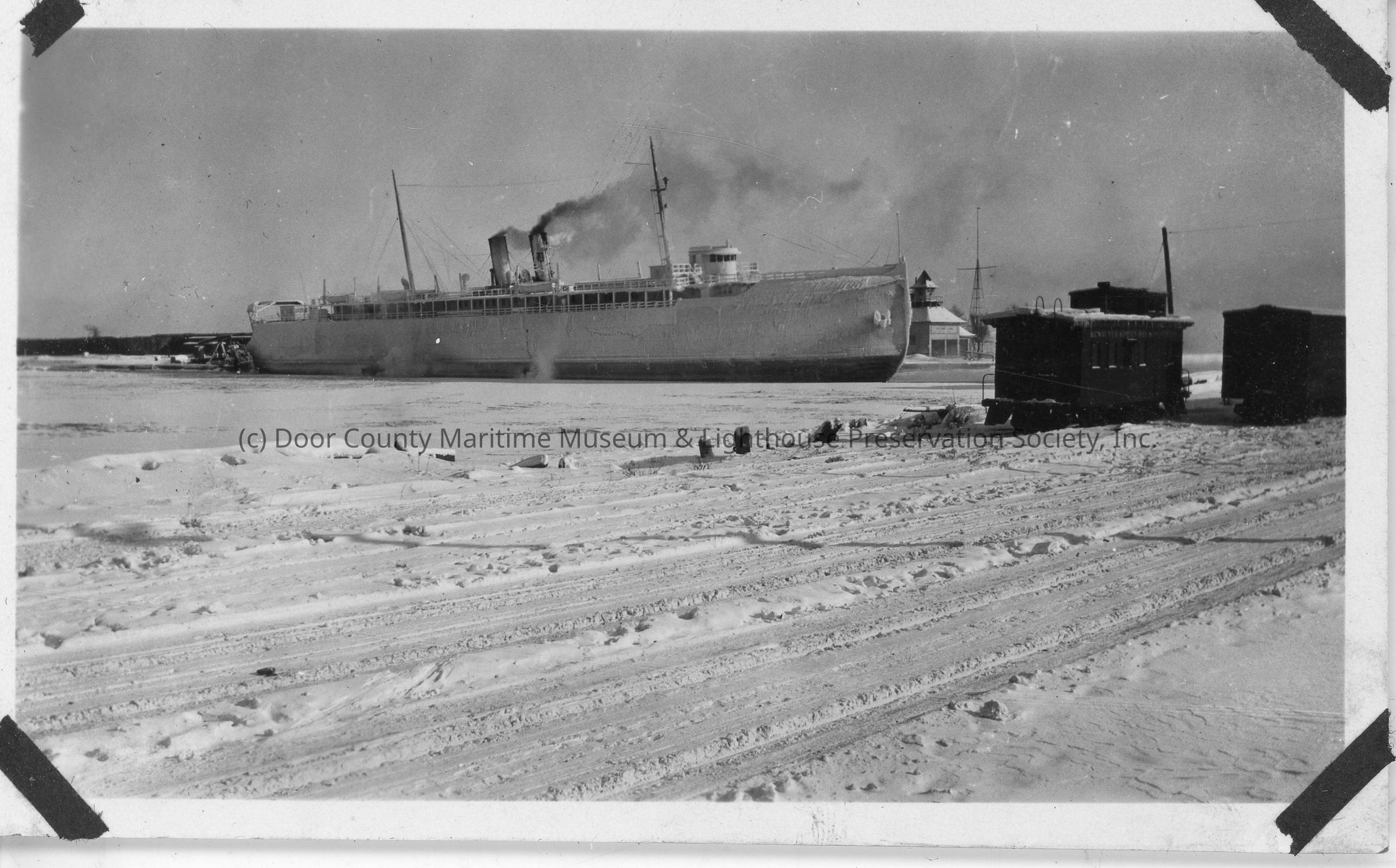 Steamship in icy water passing Coast Guard Station