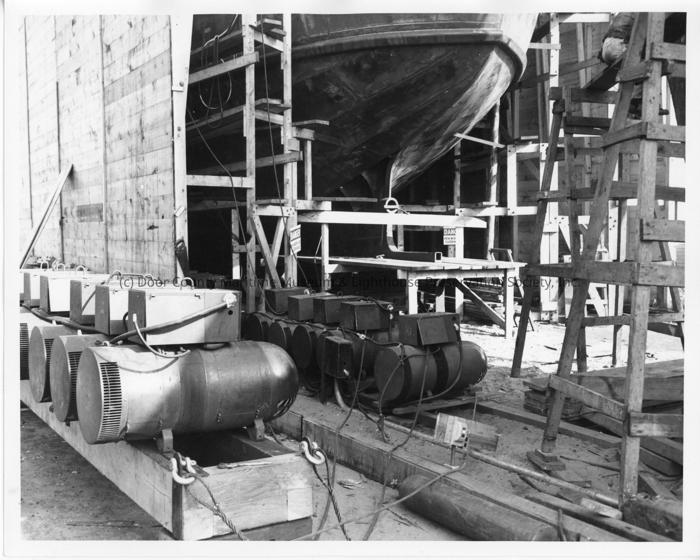 Colorless photograph. Depicts stern of ship under cover. Equipment in foregroundLocation