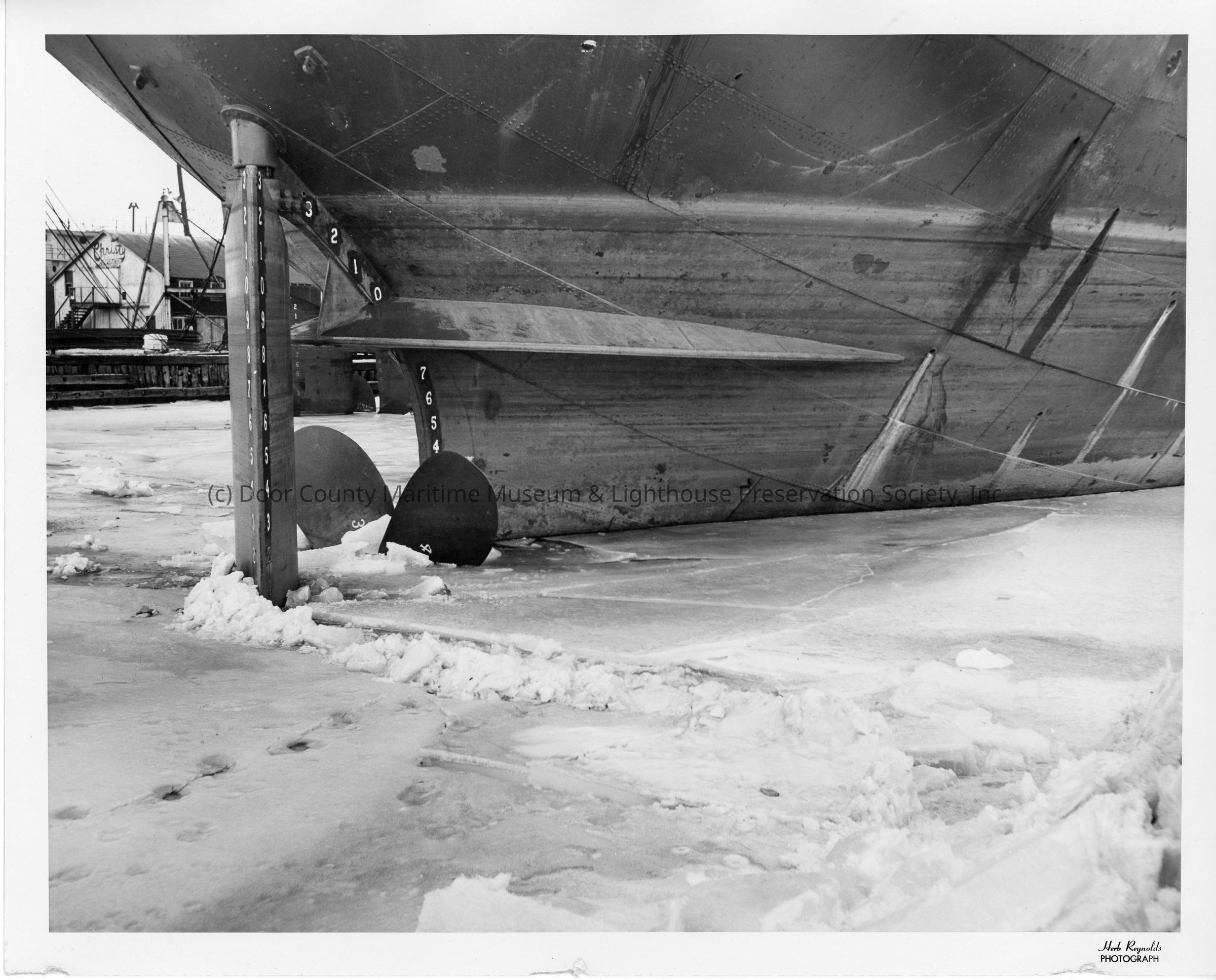 Stern of vessel in frozen water at Christy Corp January 15, 1958