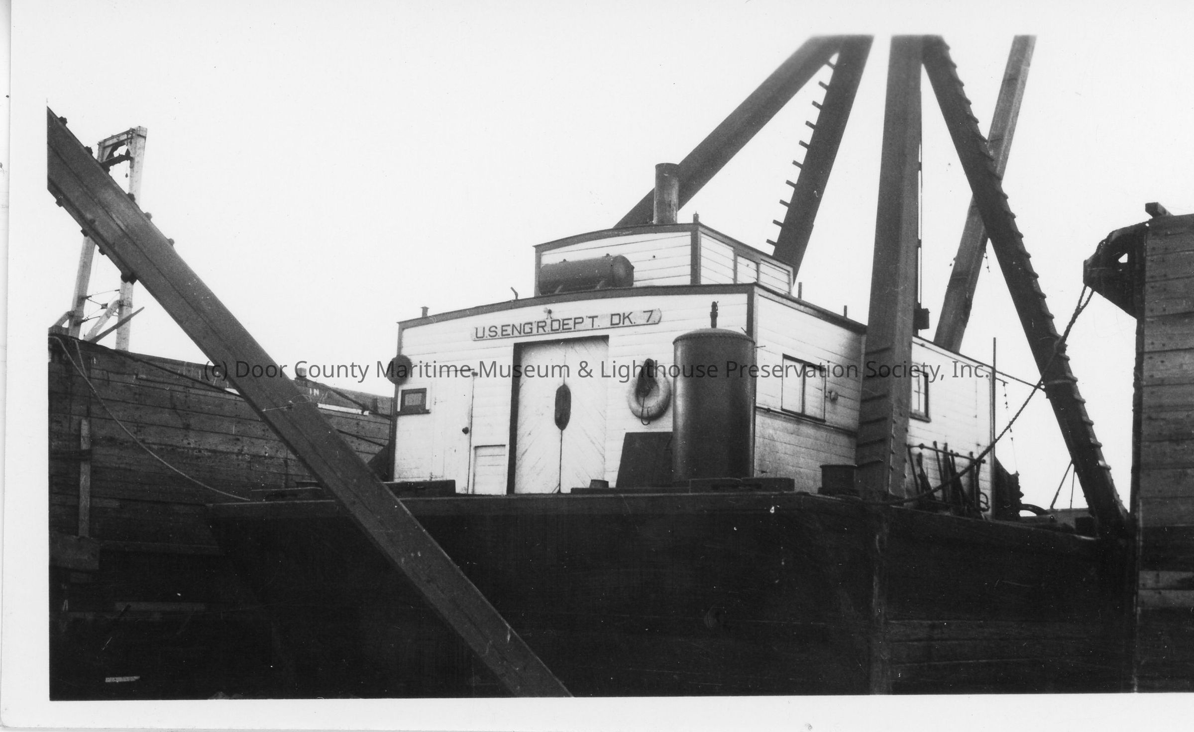 Stern starboard view of US Engineering Department dredge DK 7 in drydock