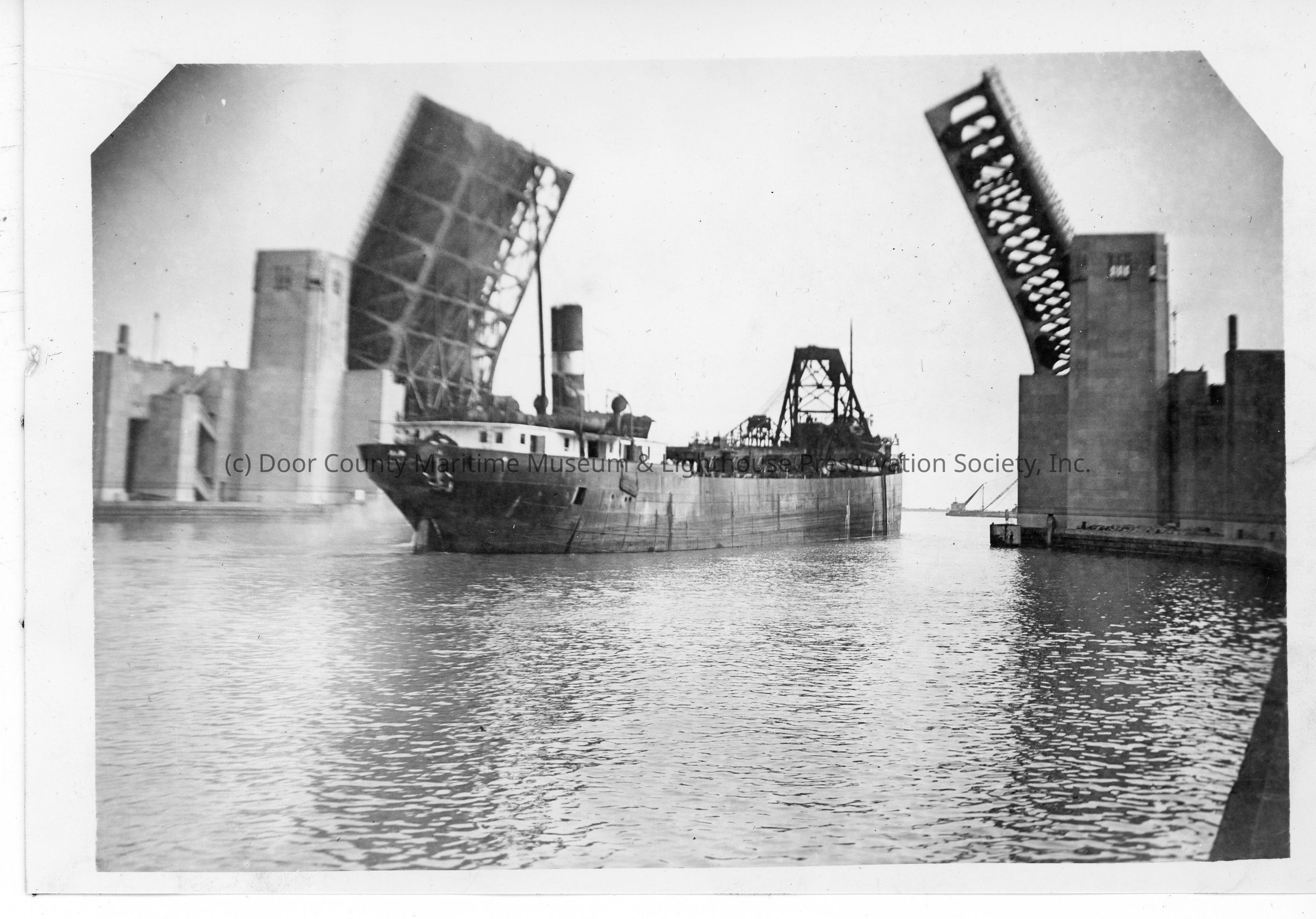 Stern view of freighter moving through open bridge
