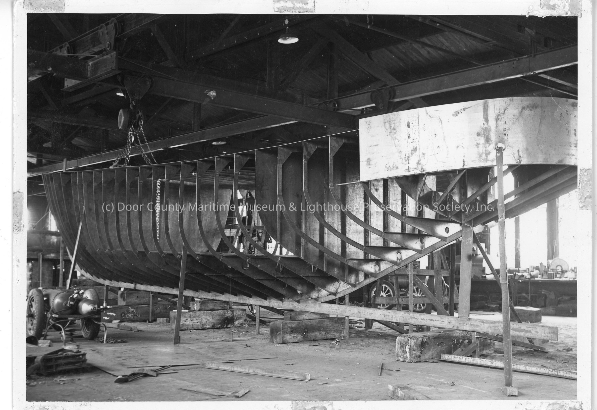 Stern view of metal skeleton of hull on wooden supportsEntry/Object ID