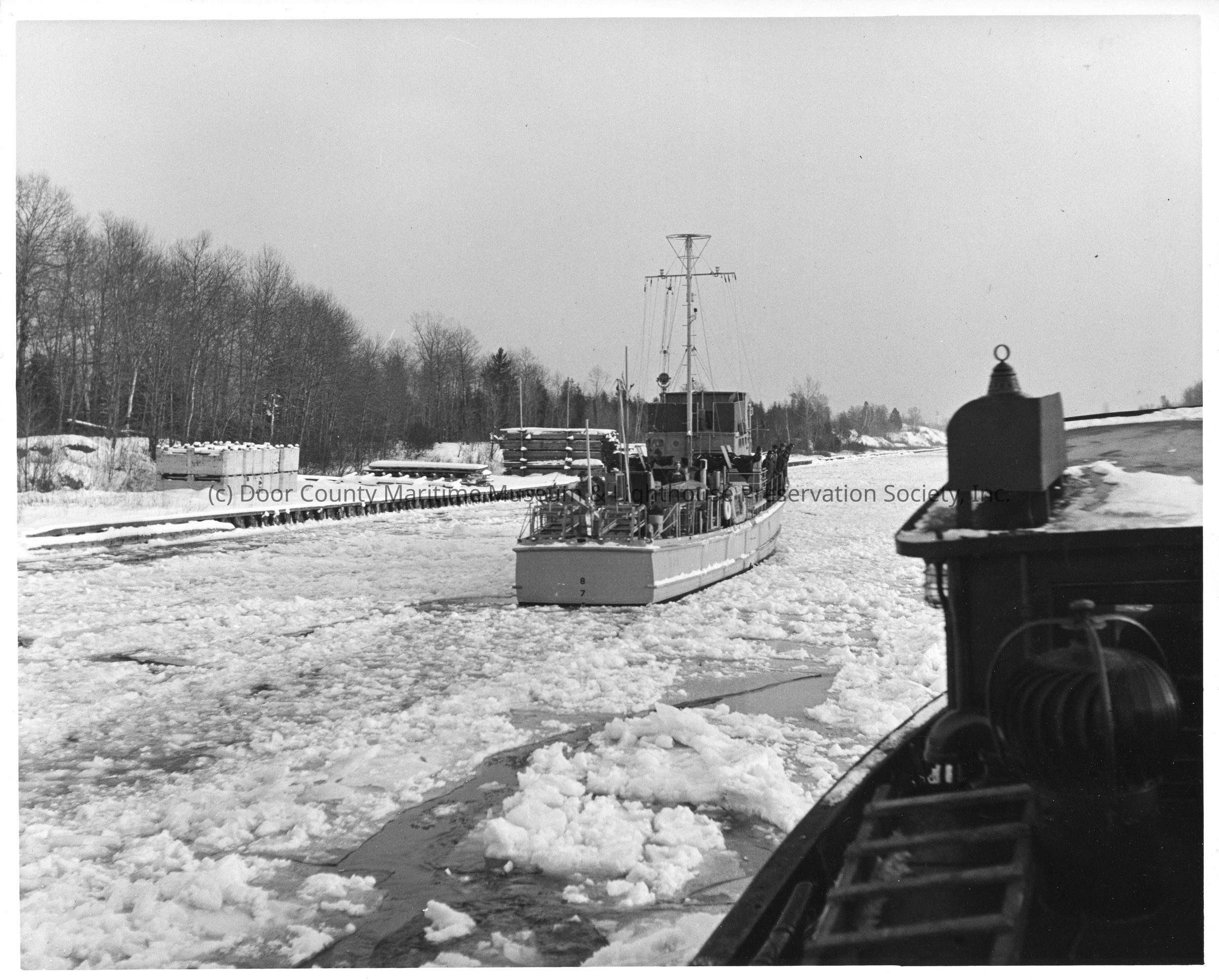 Stern view of vessel underway with men on board in canal
