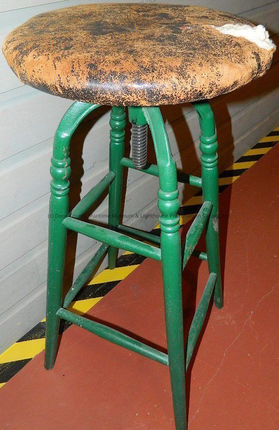 Engineer's stool; four legged painted green; black leather seat badly worn nailed on; black bracket with four arms nailed to bottom attached to swivel; two rungs on each side;Location