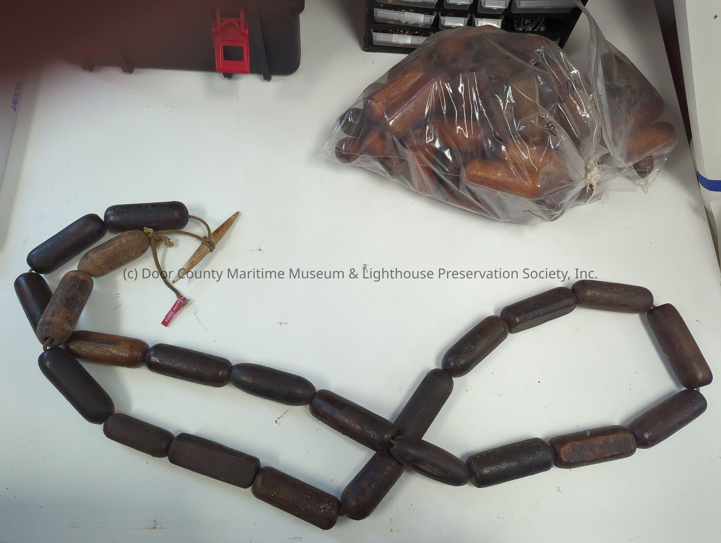 Twenty three wooden floats connected by a cord