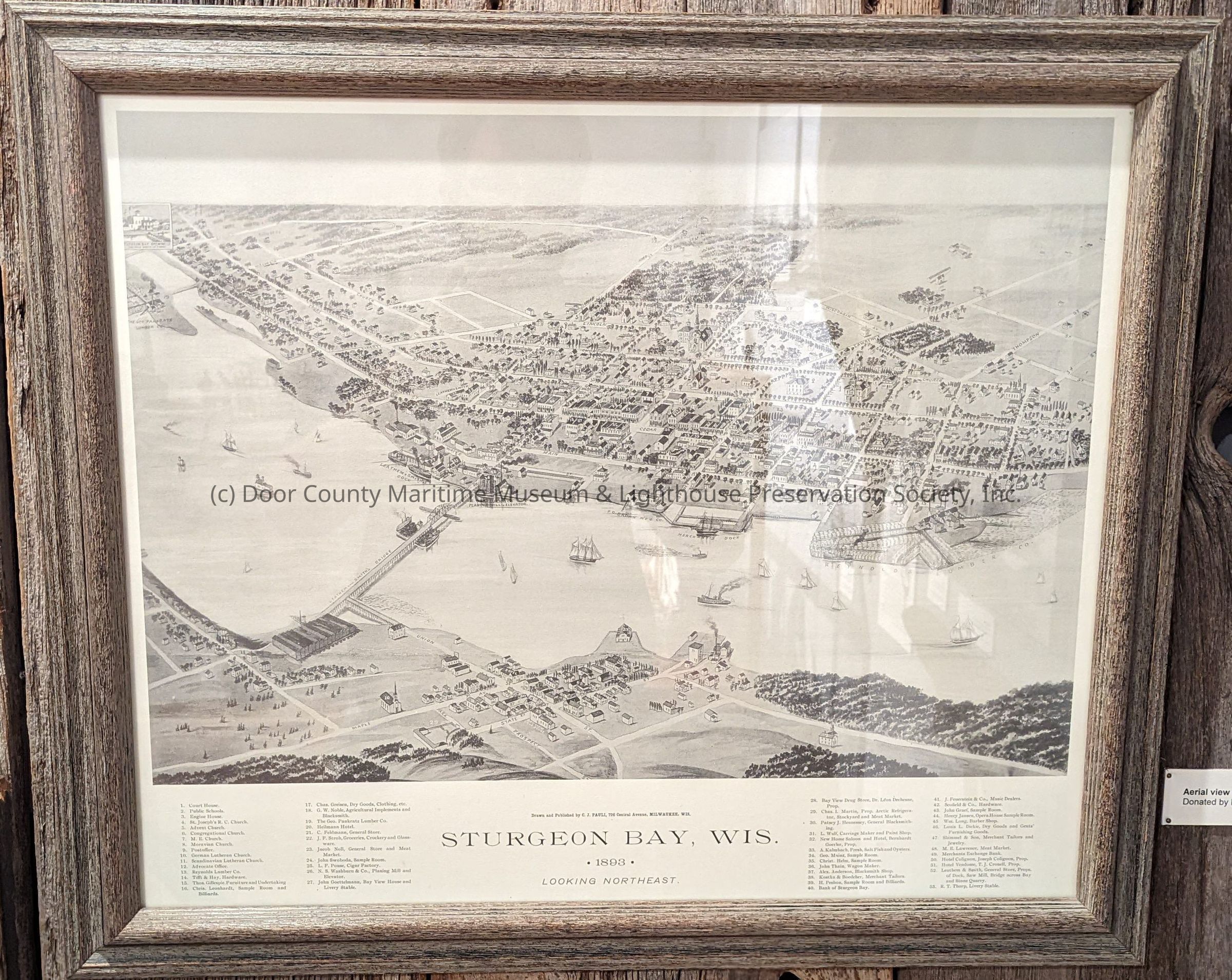 Print of aerial view of Sturgeon Bay, Wisconsin "1893" - looking northeast; buildings numbered and identification of buildings on bottom left and right; brownish wood frame; glass; wire hanger.