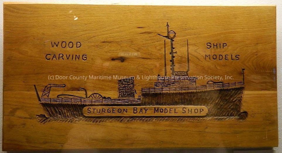 Varnished, carved ship in center with "Sturgeon Bay Model Shop" carved on hull; top left: carved "WOOD CARVING;" top right carved: "SHIP MODELS."