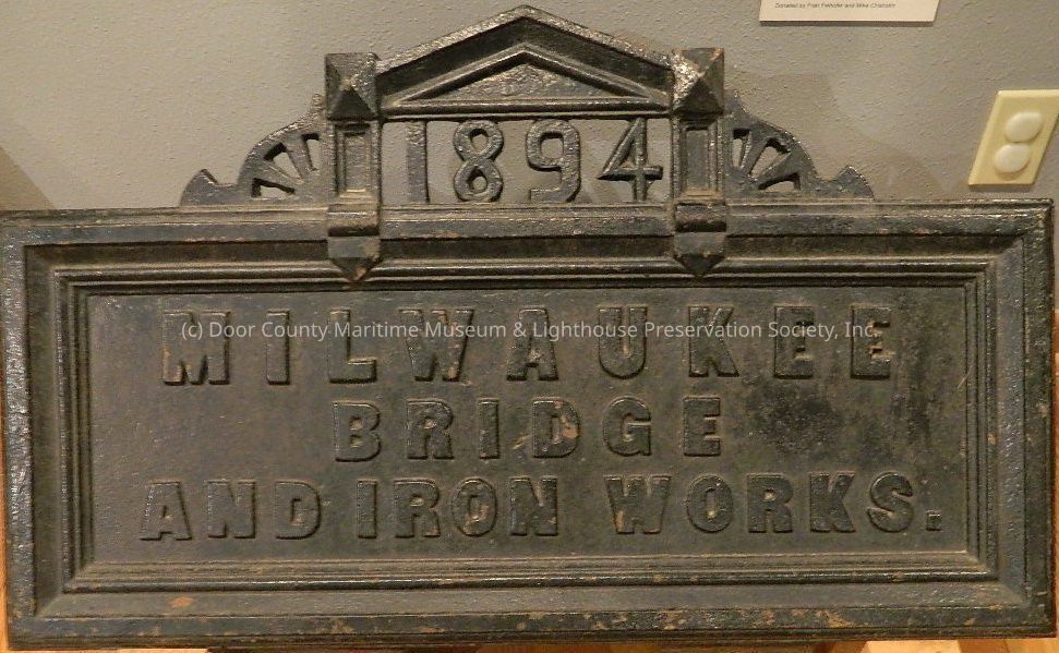 Sign is painted black (iron?) 1894 on top section; Milwaukee Bridge and Iron Works on bottom section; two brackets with two holes each; some paint chipped off and rust in spots.Location