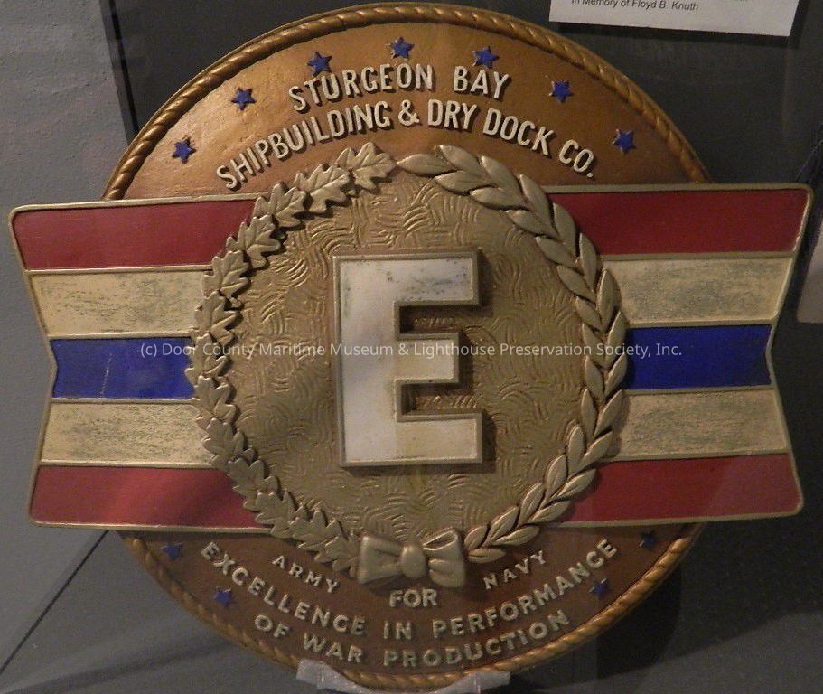Plaque represents the award given to Sturgeon Bay Shipbuilding & Dry Dock Co. during WWII for excellence in war production; round with letter "E" in middle; blue stars; red, white, blue flag color; bronze color backing.Location