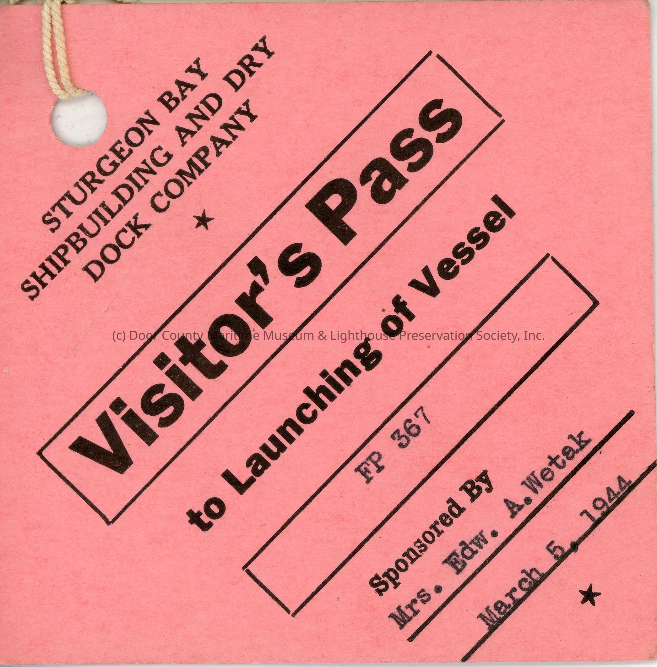 Sturgeon Bay Shipbuilding and Dry Dock Company FP-367 launching visitor's pass