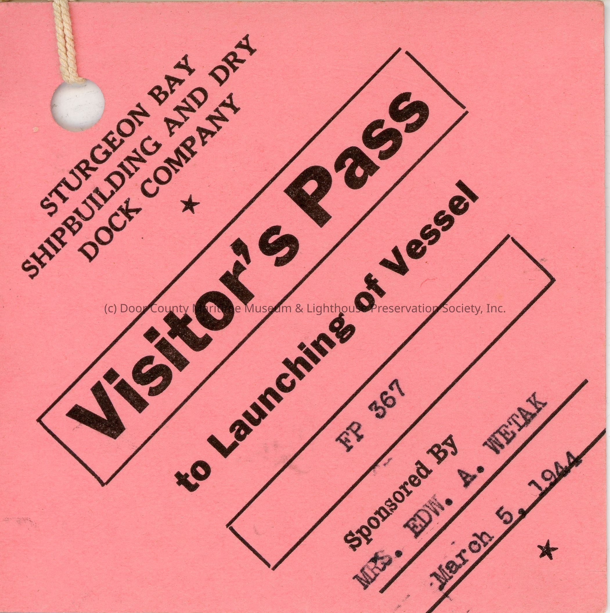 Sturgeon Bay Shipbuilding and Dry Dock Company FP-367 launching visitor's pass