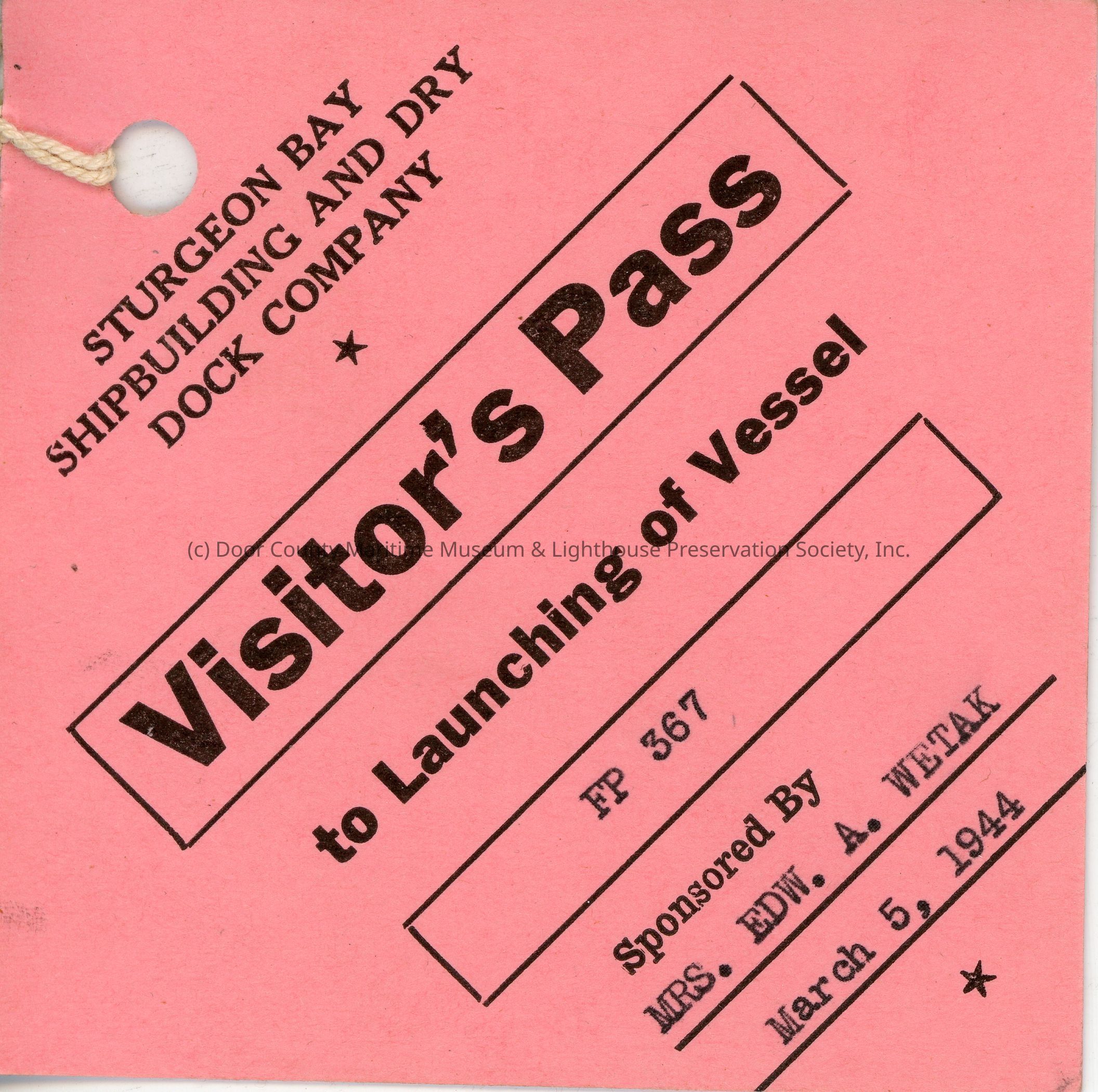 Sturgeon Bay Shipbuilding and Dry Dock Company FP-367 launching visitor's pass