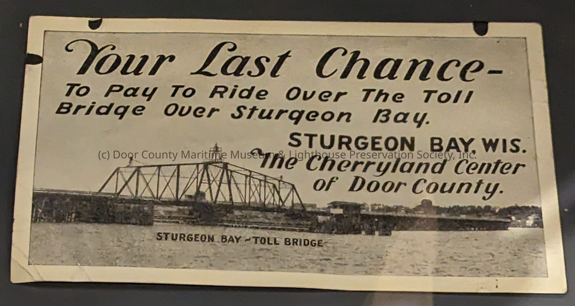 Postcard black on white; photo of Sturgeon Bay toll bridge "Your last chance to pay to ride over the toll bridge over Sturgeon Bay, STURGEON BAY, WI. The Cherry Land Center of Door County."Location