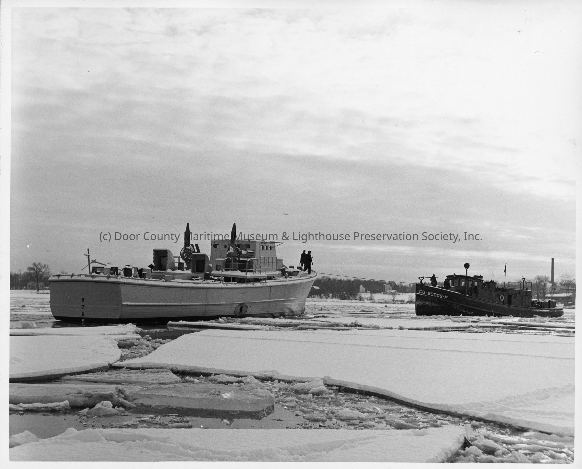 Subchaser being towed by tugboat in icy water