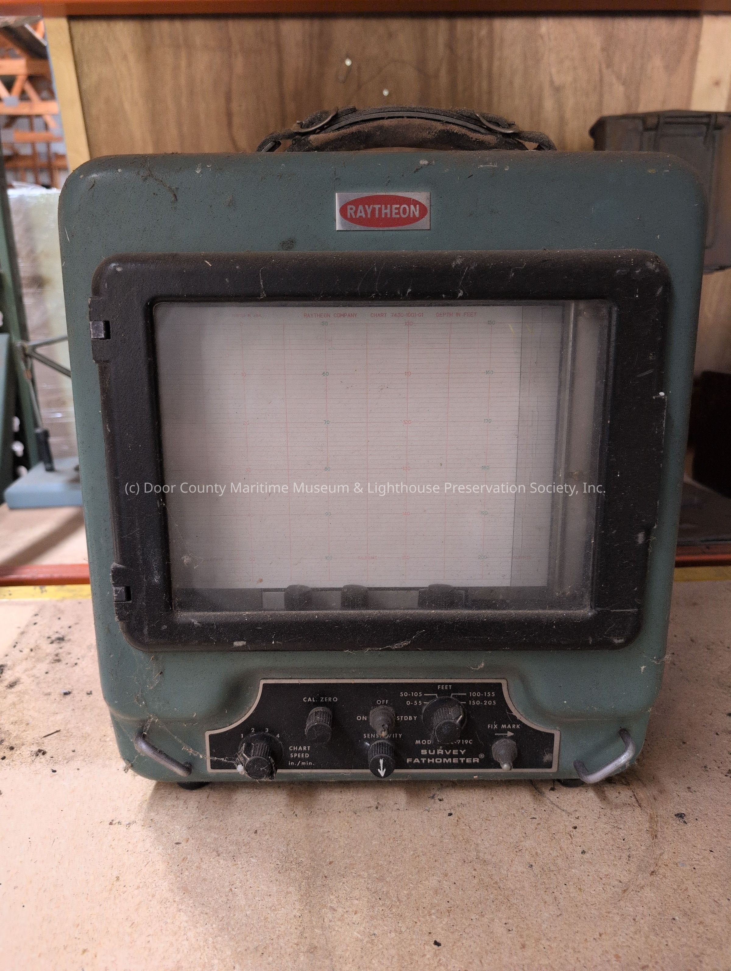 Rectangular green metal case. Black leather handle on top. Clear plastic windows with black metal frame. Black metal plate in front with knobs. Paper chart show through window silver latches. Two black rubber pads on bottom