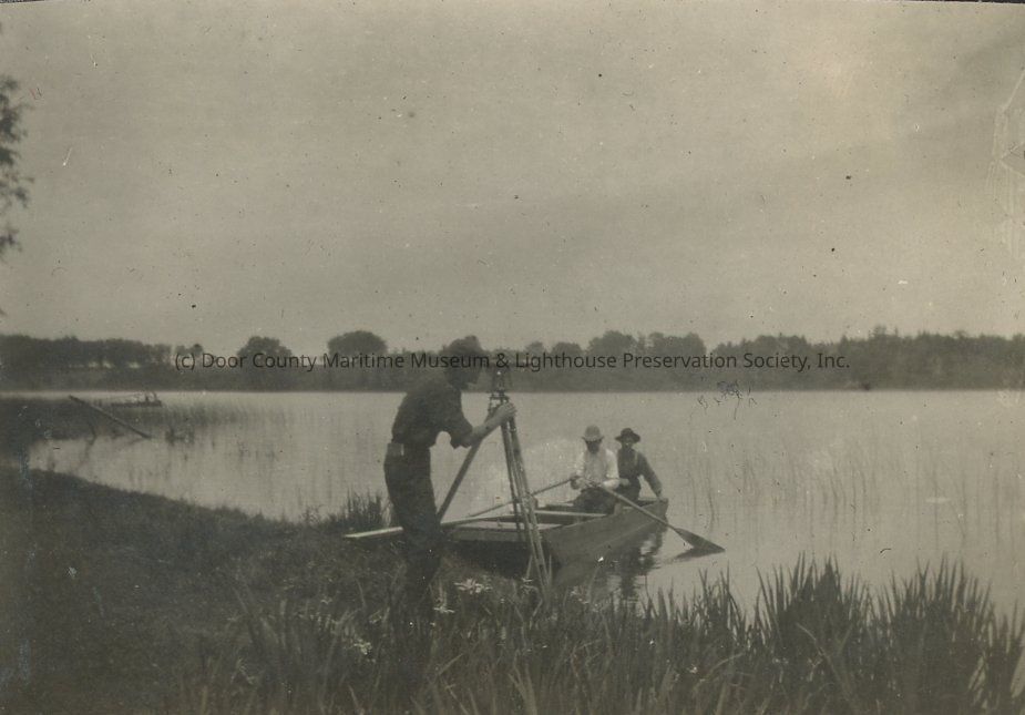 Surveyor uses transit along shoreline Two men wait in rowboat