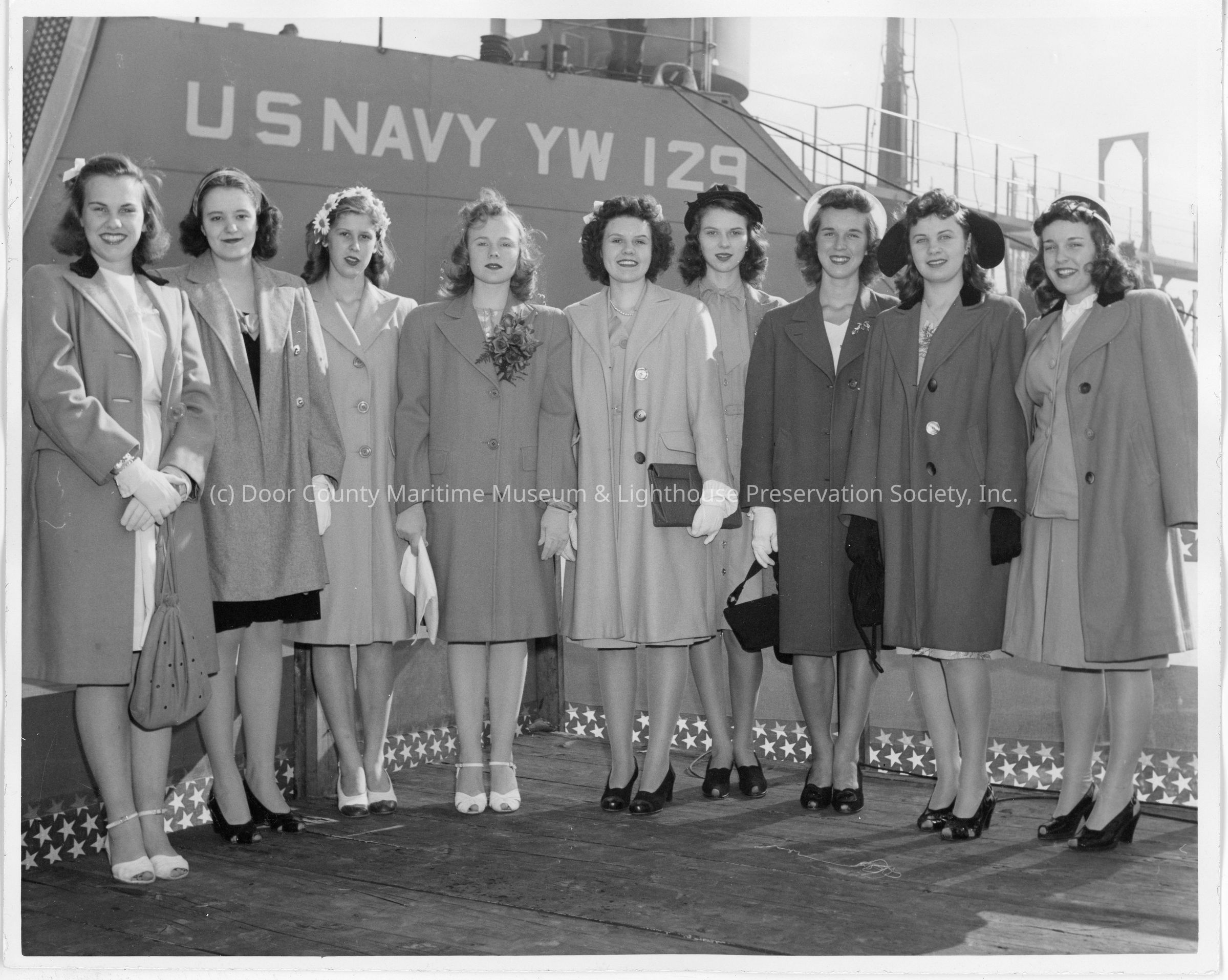 Suzanne and Patsy Smith with seven people in front of YW-129Entry/Object ID