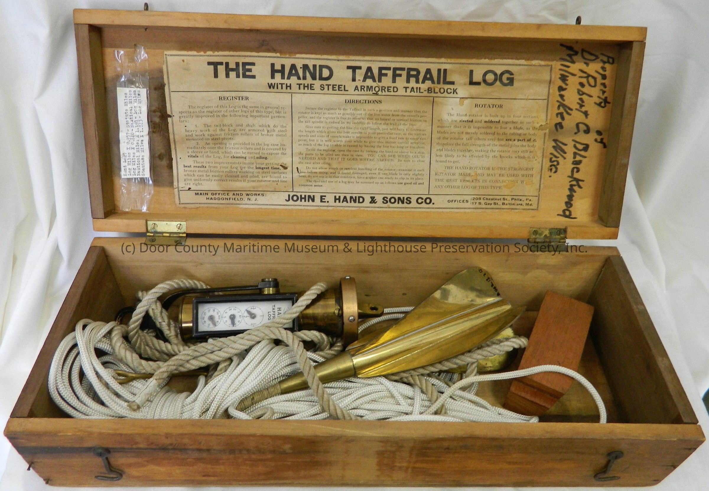 Register section is gold metal with black handle and black case around reddings which are white with black print. Three dials. White rope attached to handle. Rotation is gold metal with four blades