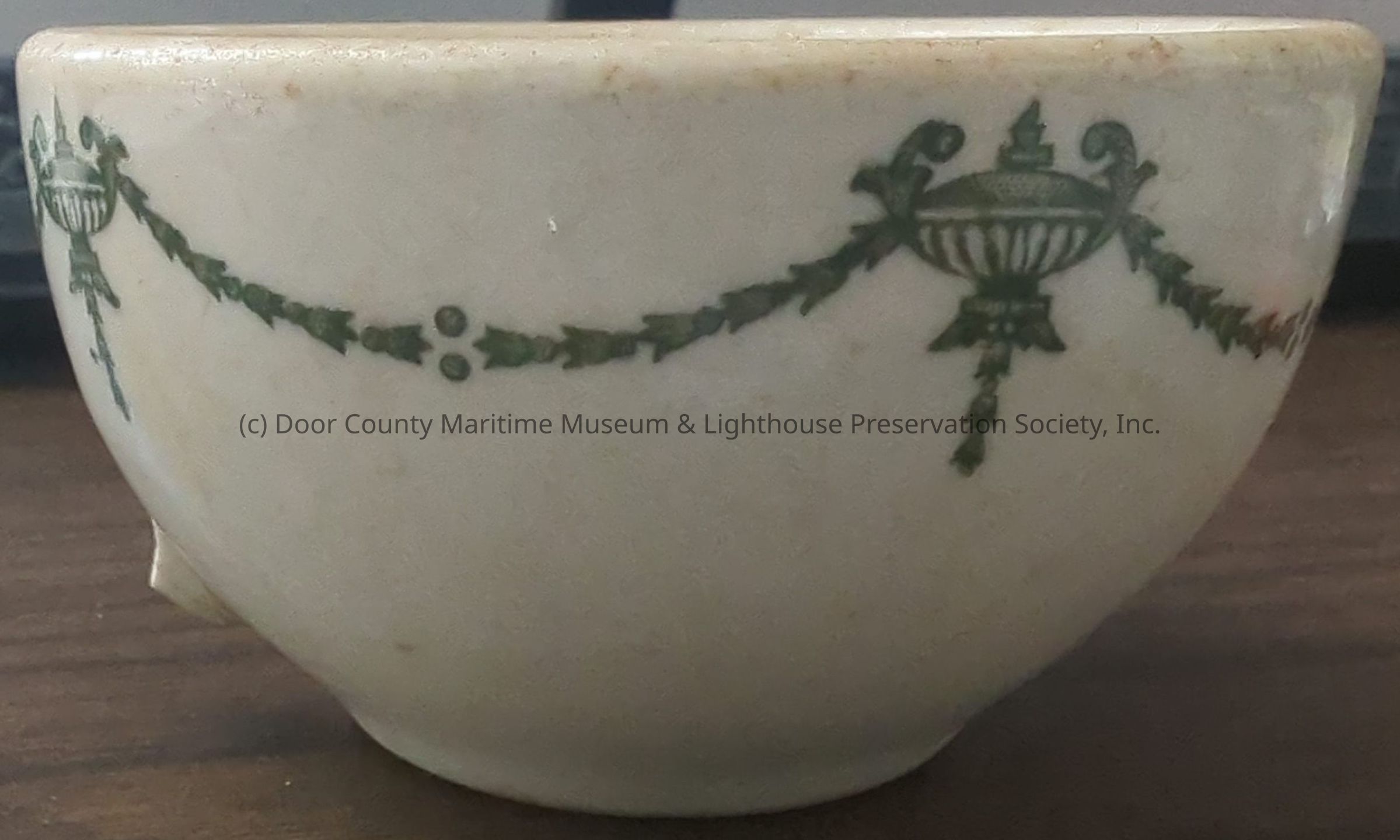 Porcelain teacup with floral and vase design around rim. Handle broken off