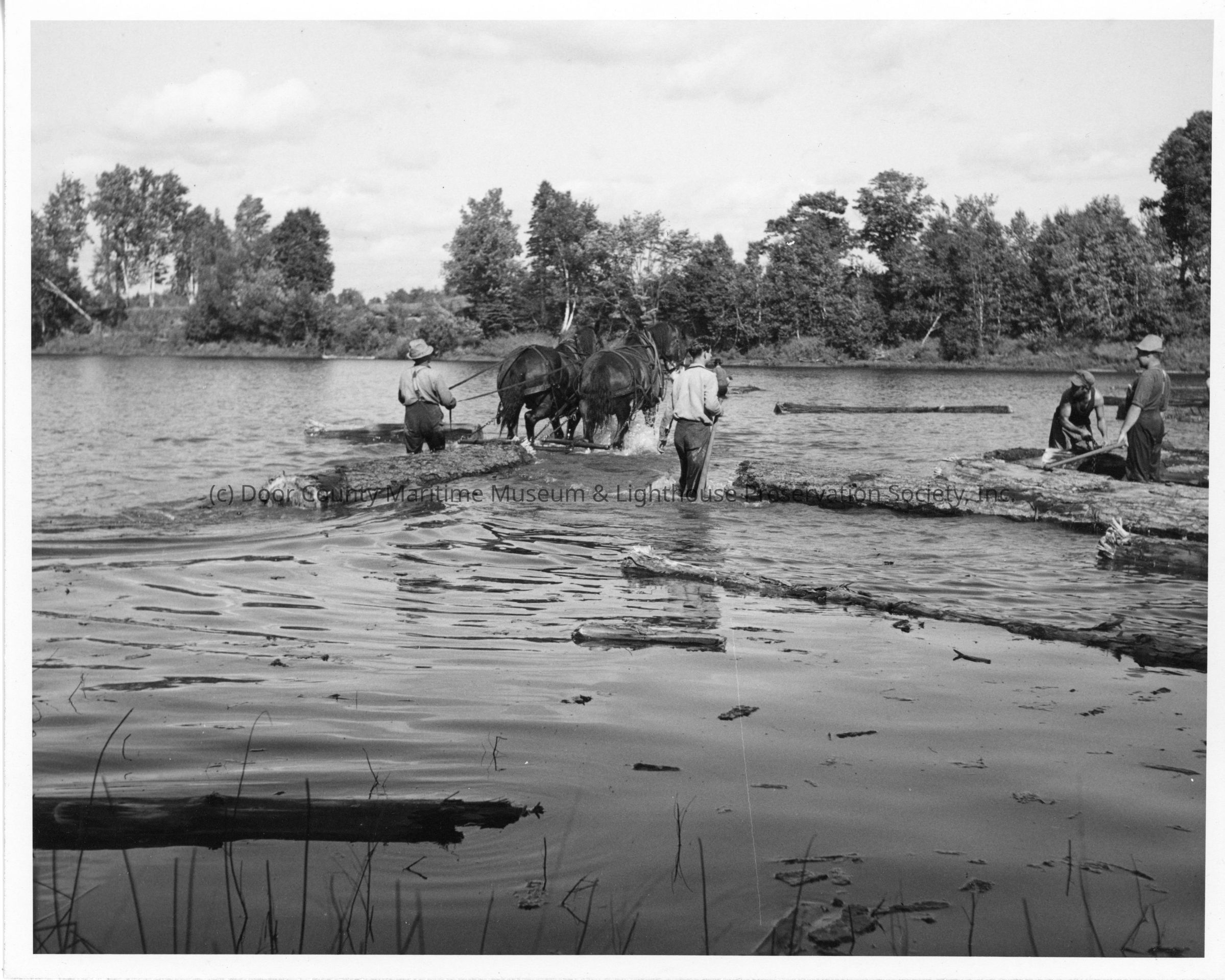 Team of horses dragging a log through a river mississagi drive August 1944