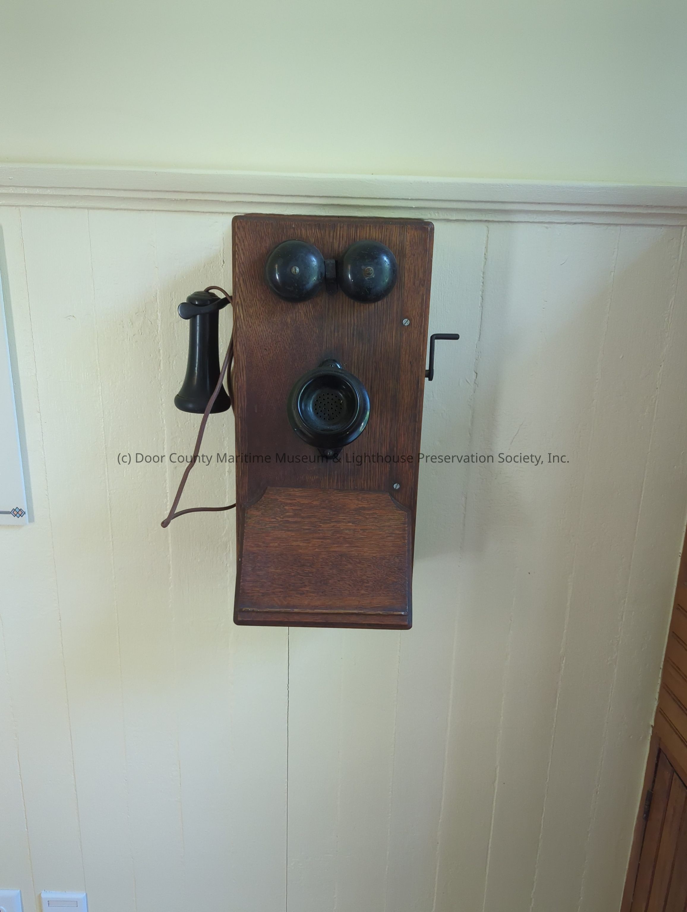 Telephone: brown varnished wood; two black bells on front; black speaker piece on front; listening device on side with hook; brown cord; front also has extended area for taking notes; crank on right side.Location