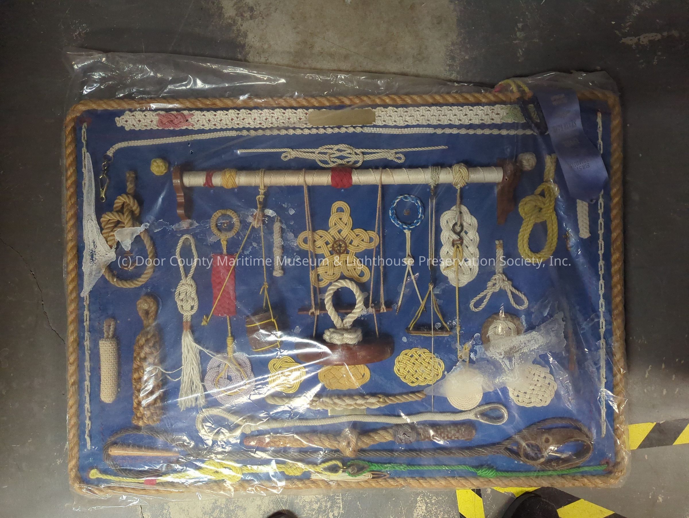 Knot board: board covered with blue cloth; framed with rope; gold metal plate top center "The Arts of a Sailor"; a variety of knots (white, tan, yellow, gold, blue, red, green, gray); also a wooden fid; additional wood objects; metal "pins"; blue ribbon (first premium) from Upper Peninsula State Fair, Escanaba, MI) attached to upper right corner; three metal clips for hanging on back.Location