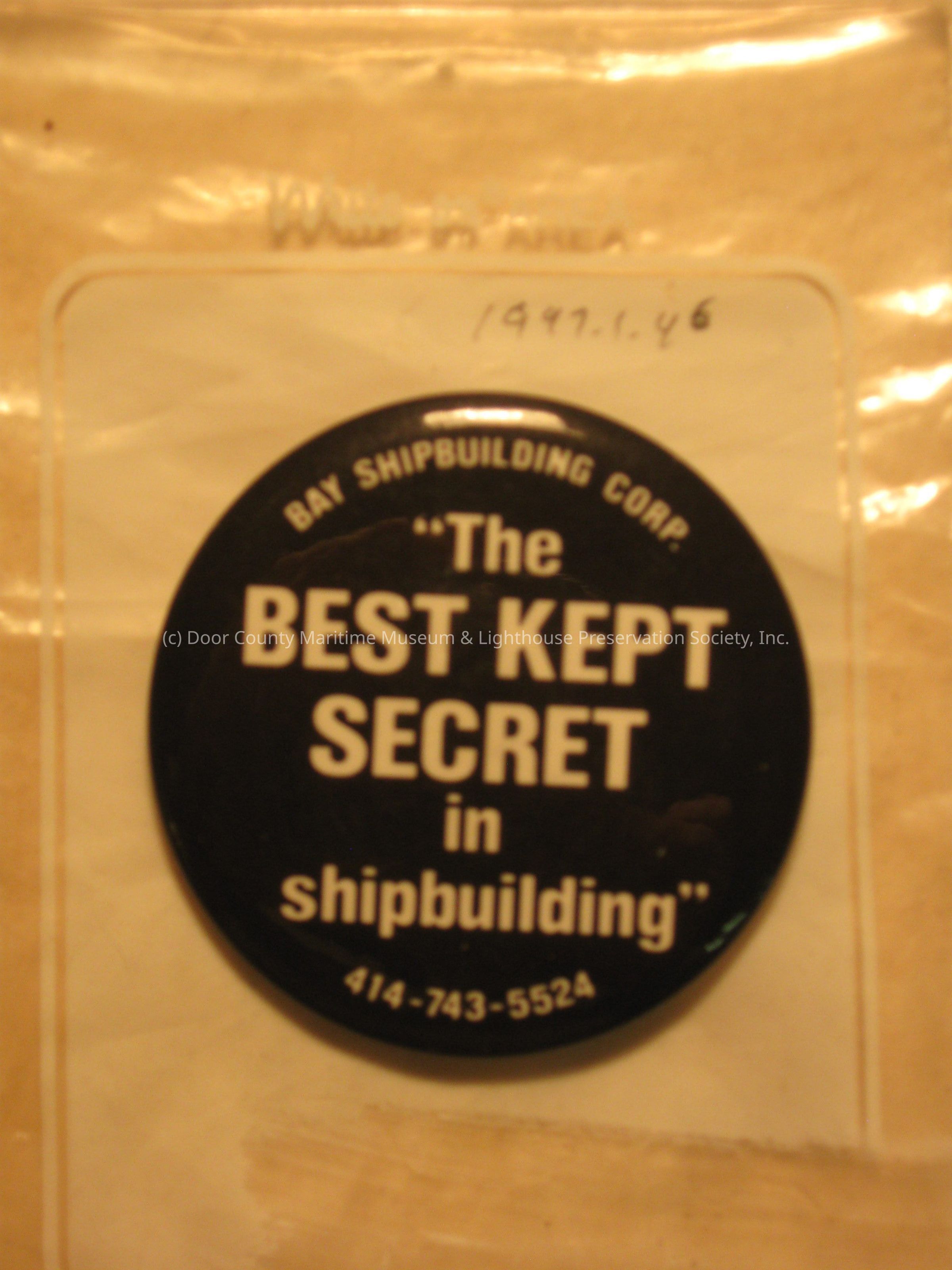Pin, Black with white letters. Reads "The Best Kept Secret in Shipbuilding, Bay Shipbuilding Corp. 414-743-5524".