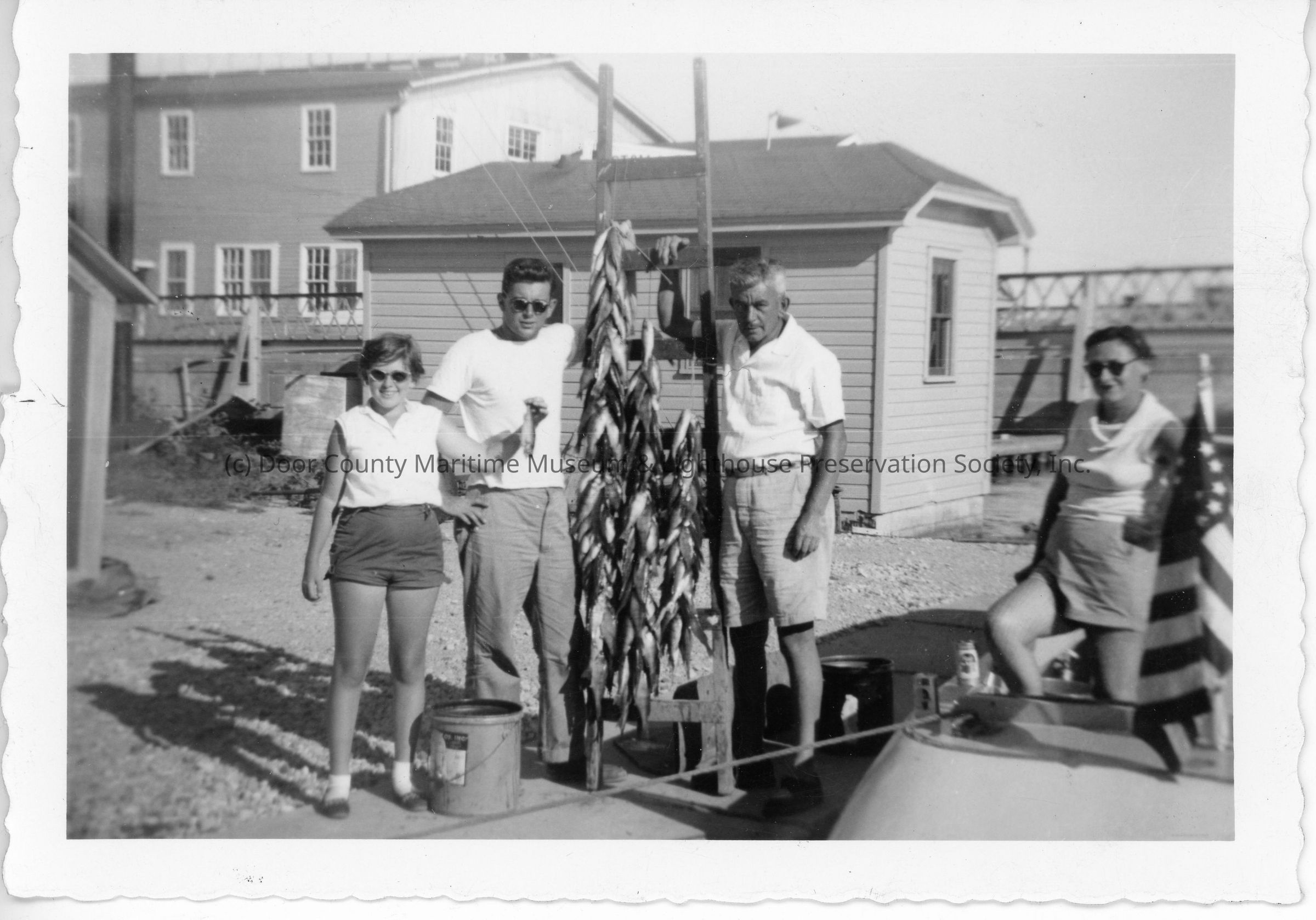 The Emmanuel's standing near a bunching of hanging fish