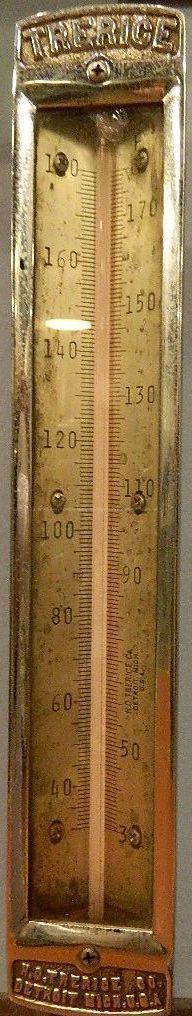 Chrome thermometer; silver indented with black numbers and lines; measures 30 degrees to 180 degrees F;